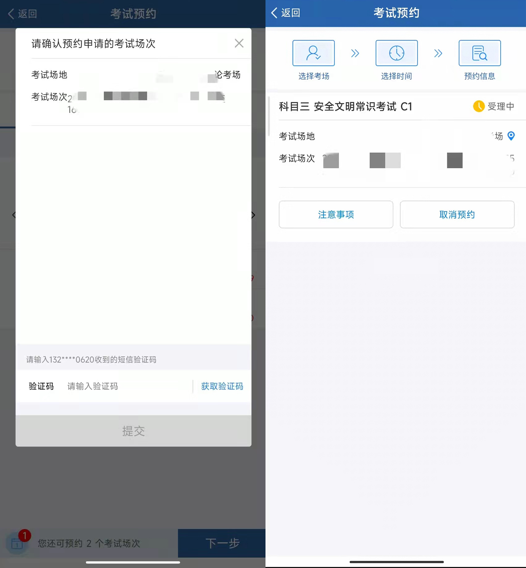 6、再次提示用户确认所选的考试地点、考试场次等信息,信息确认,系统短信核验通过后,完成考试预约申请提交。