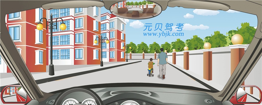 【元贝解析】由图可知前方是陪着骑车儿童的长辈,以防儿童突然改变方向或是从小车子上掉落,因此要保持一定的安全距离,减速慢行,必要时停车避让。紧跟其后是错误的行为。