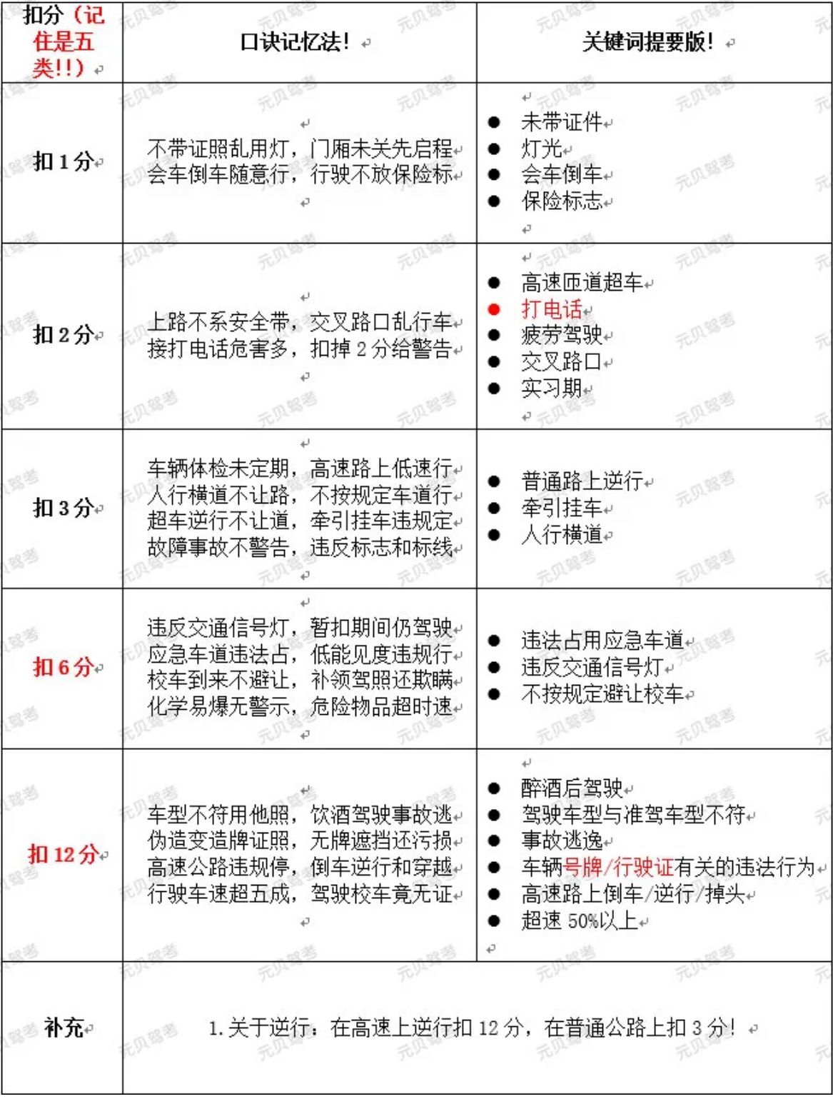 下面元贝驾考小编将各类扣分题提炼出关键词,并且展示了记忆口诀,方便于学员备考科目一扣分题,助大家一把拿下科目一!