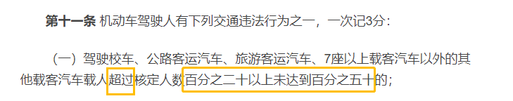 法规条例中规定的是“超过”核定人数百分之二十以上未达百分之五十的一次记3分,有人提出疑问:那正好达到20%的扣不扣分呢?毕竟五座车多一个人就达到百分之二十了。