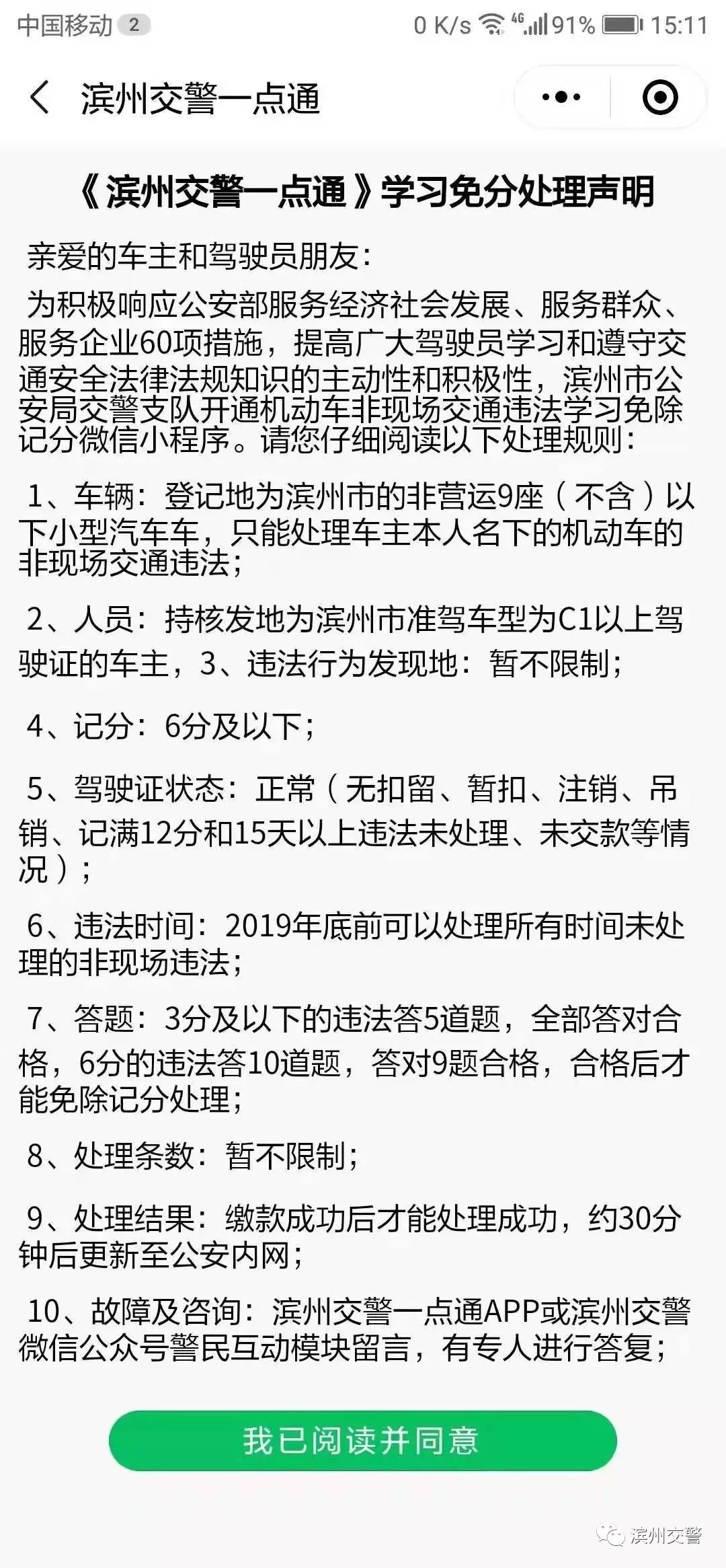 为积极响应公安部服务经济社会发展、服务群众、服务企业60项措施,提高广大驾驶员学习和遵守交通安全法律法规知识的主动性和积极性,滨州市公安局交警支队开通机动车非现场交通违法学习免除记分微信小程序。请您仔细阅读以下处理规则: