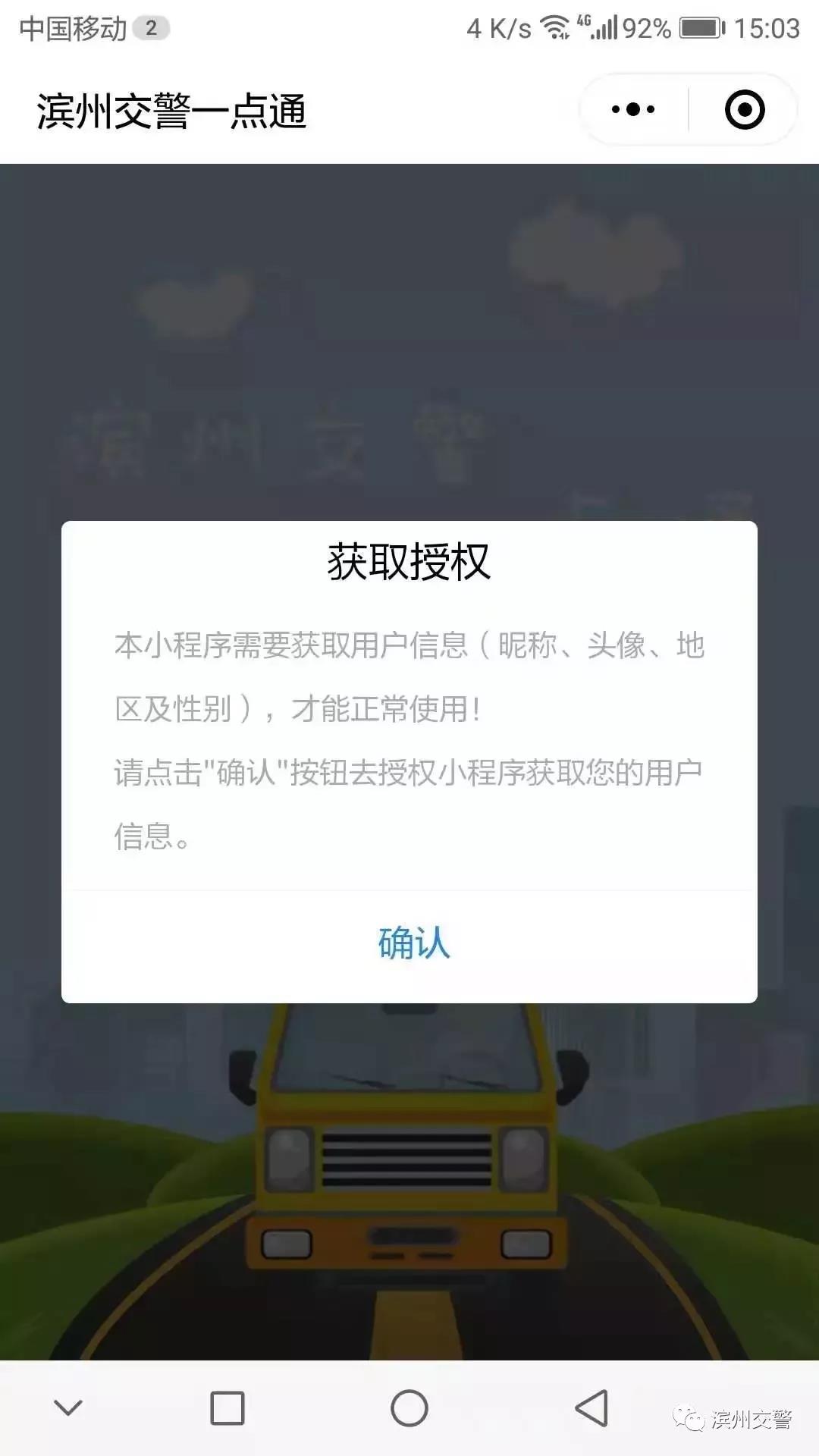 扫描二维码关注滨州交警一点通小程序,系统提示获取授权点击“确认”即可。