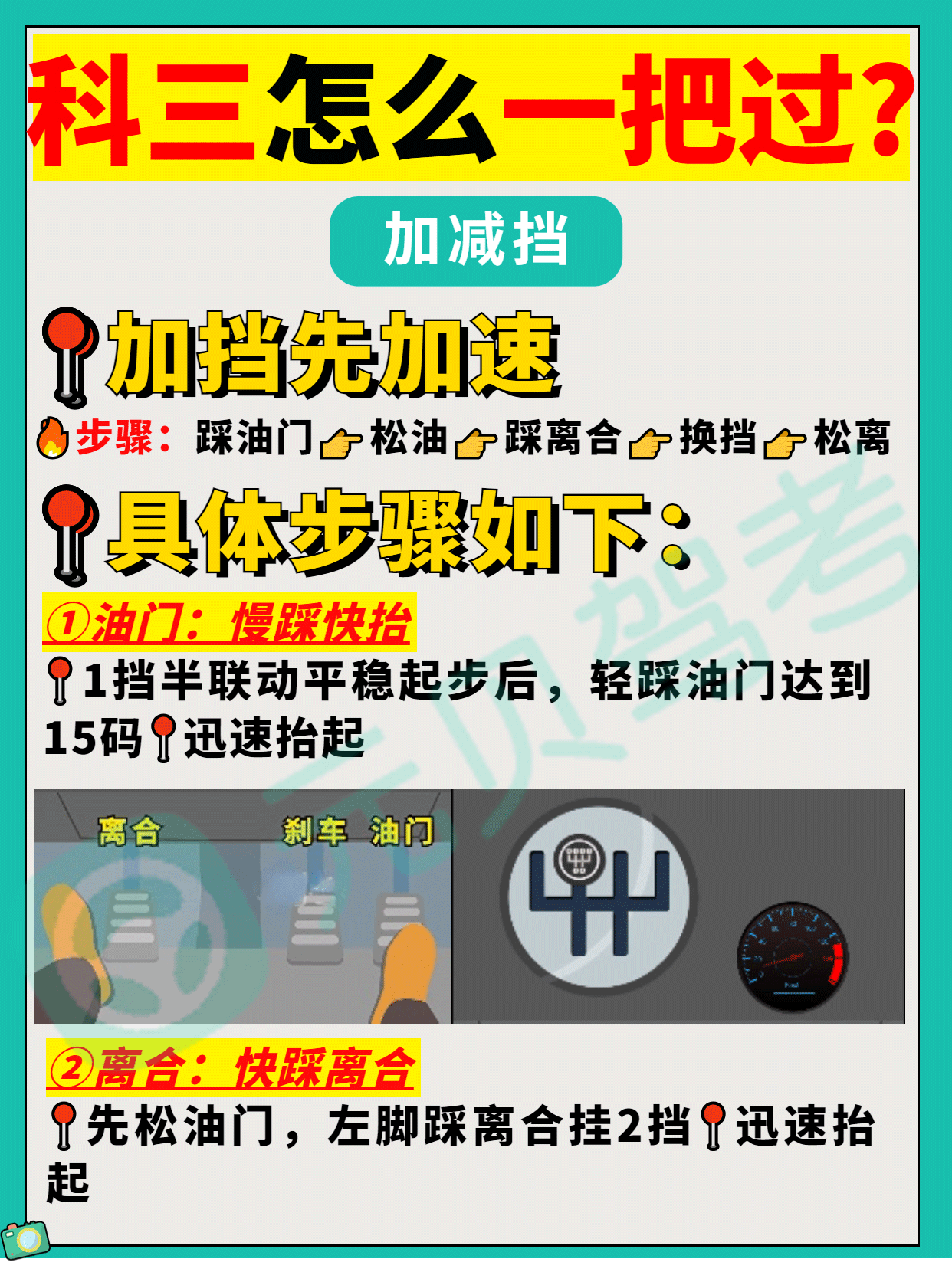 加挡先加速,步骤:踩油门、松油踩离合、换挡松离合。