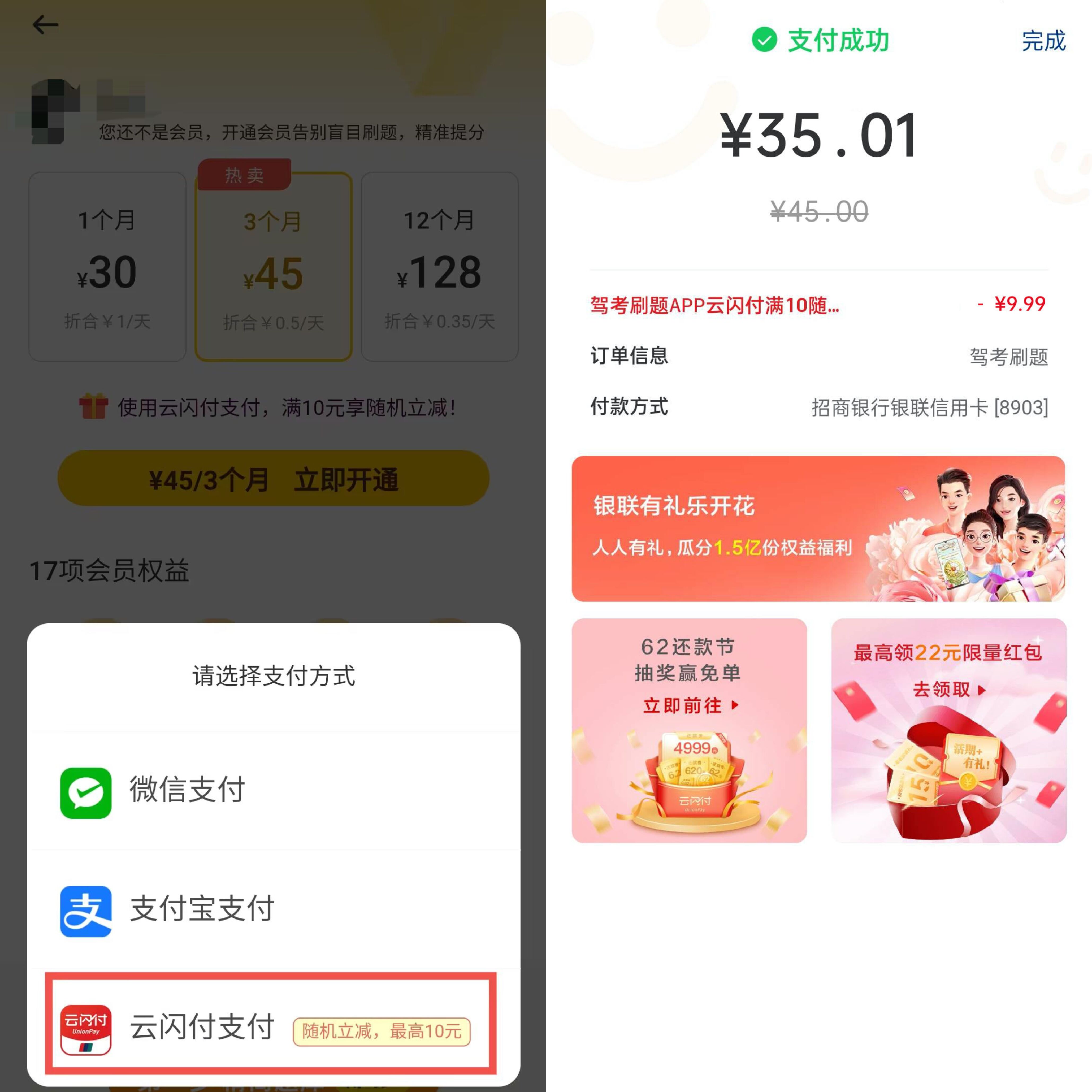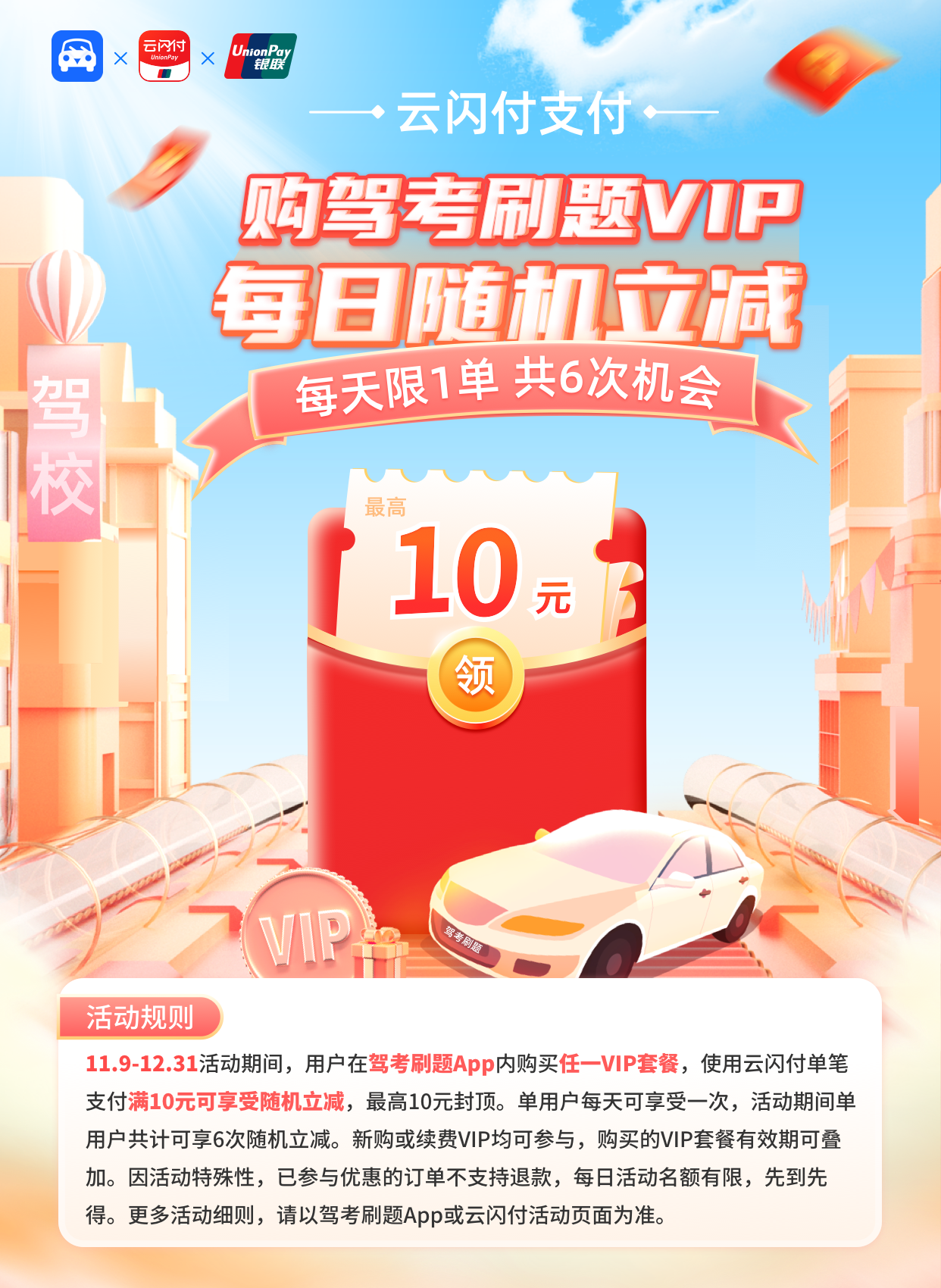 1、购买驾考刷题vip时(任何套餐都可),使用云闪付单笔支付满10元,即可享受随机立减,最高10元封顶!