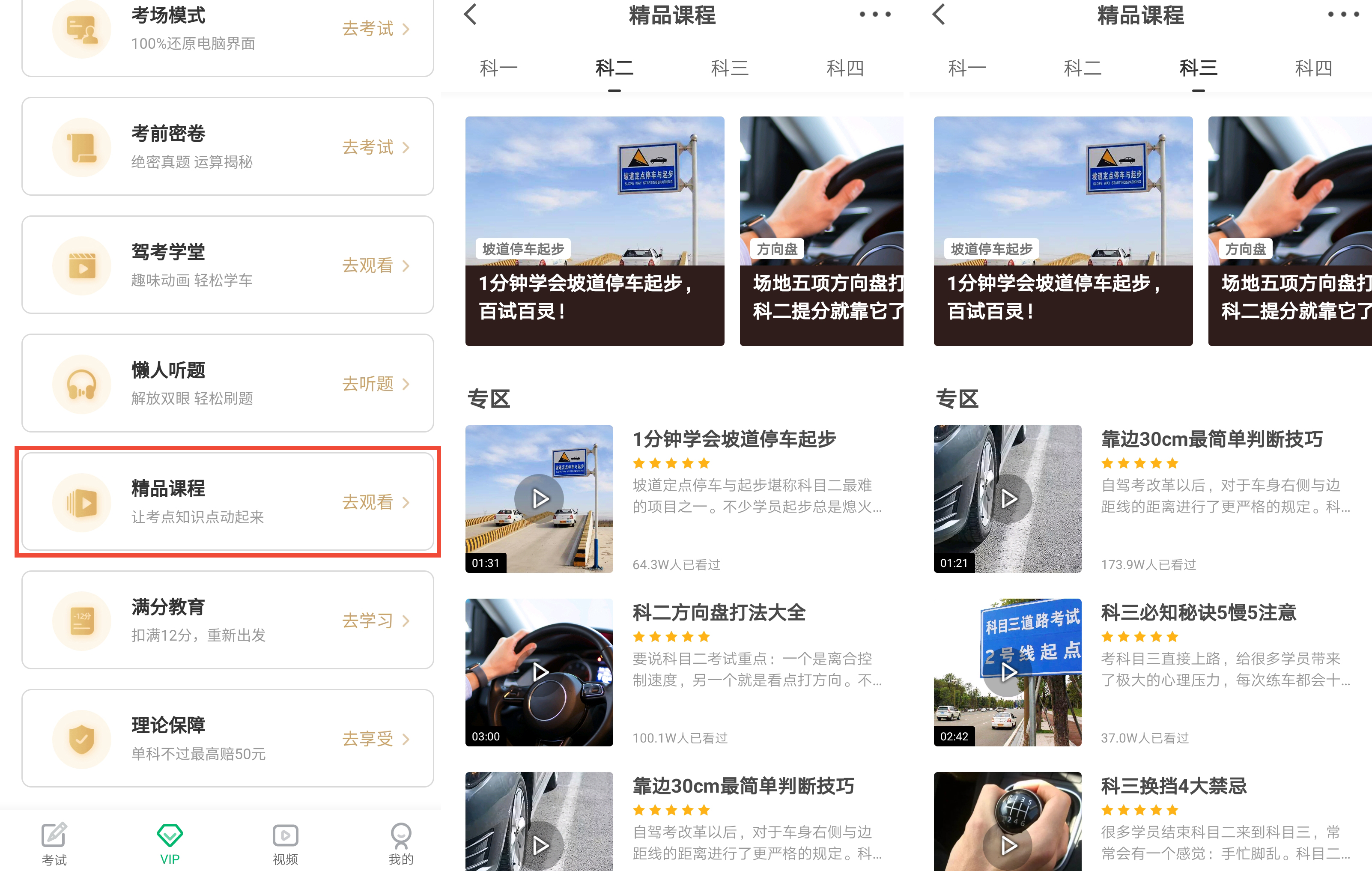 如果担心在驾校的时候上车学习时间太短,自己掌握不够全面的话,可以使用【精品课程】功能查漏补缺、强化学习。