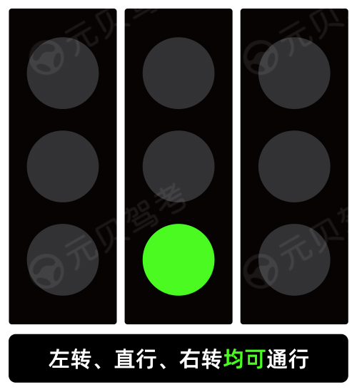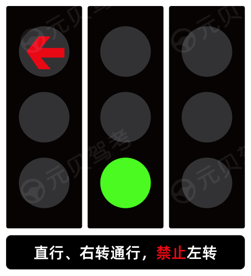 2、当圆盘灯亮绿灯,右转箭头灯不亮,左转箭头灯红灯的时候,可以直行或者右转,禁止左转。