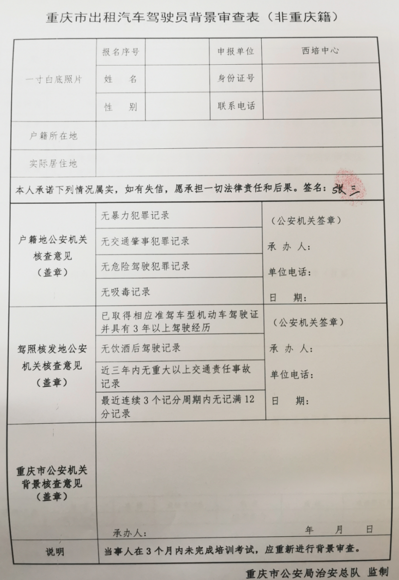 3、注:如户口或驾照有外地证件人员,请填写个人基本信息签字盖手印,填写非重庆籍背景审查表,采取密封函的形式送达,密封函根据非重庆籍驾驶员户籍或驾籍所在地公安机关要求章;