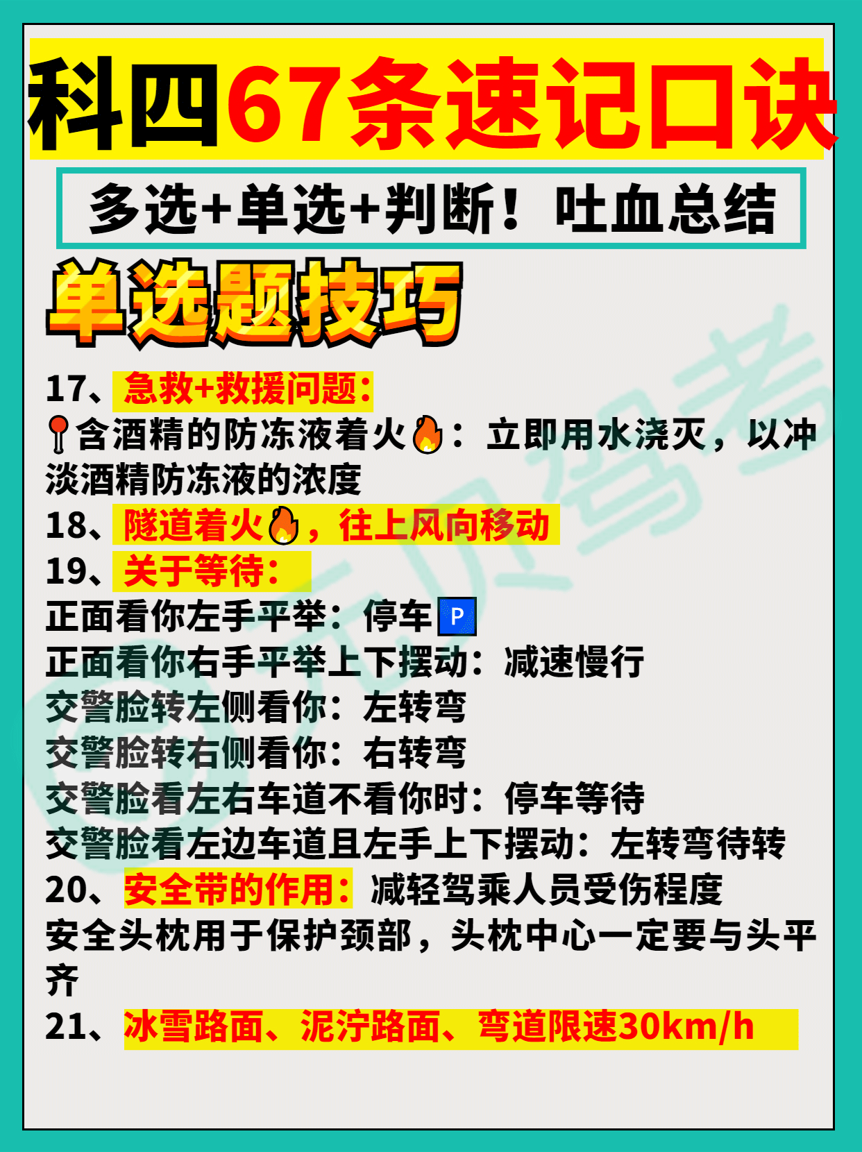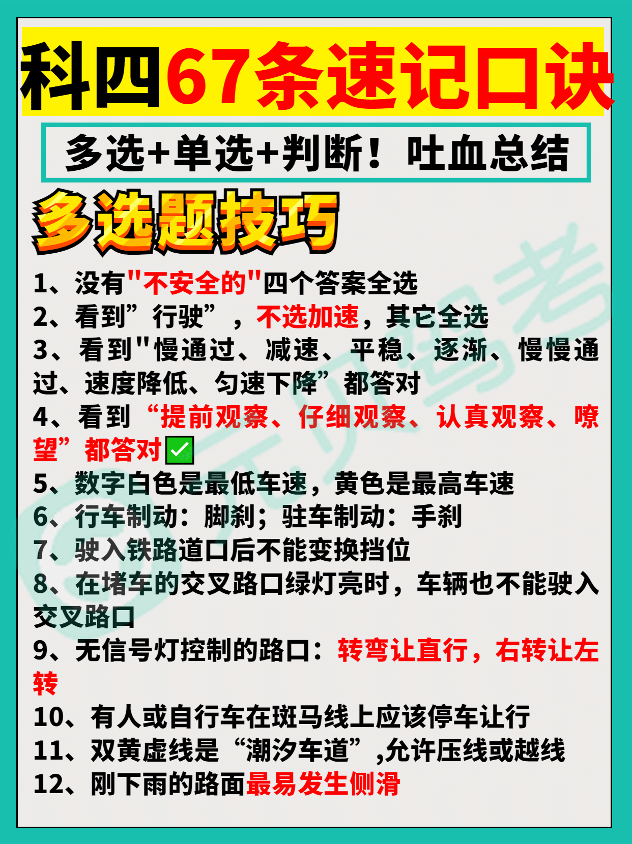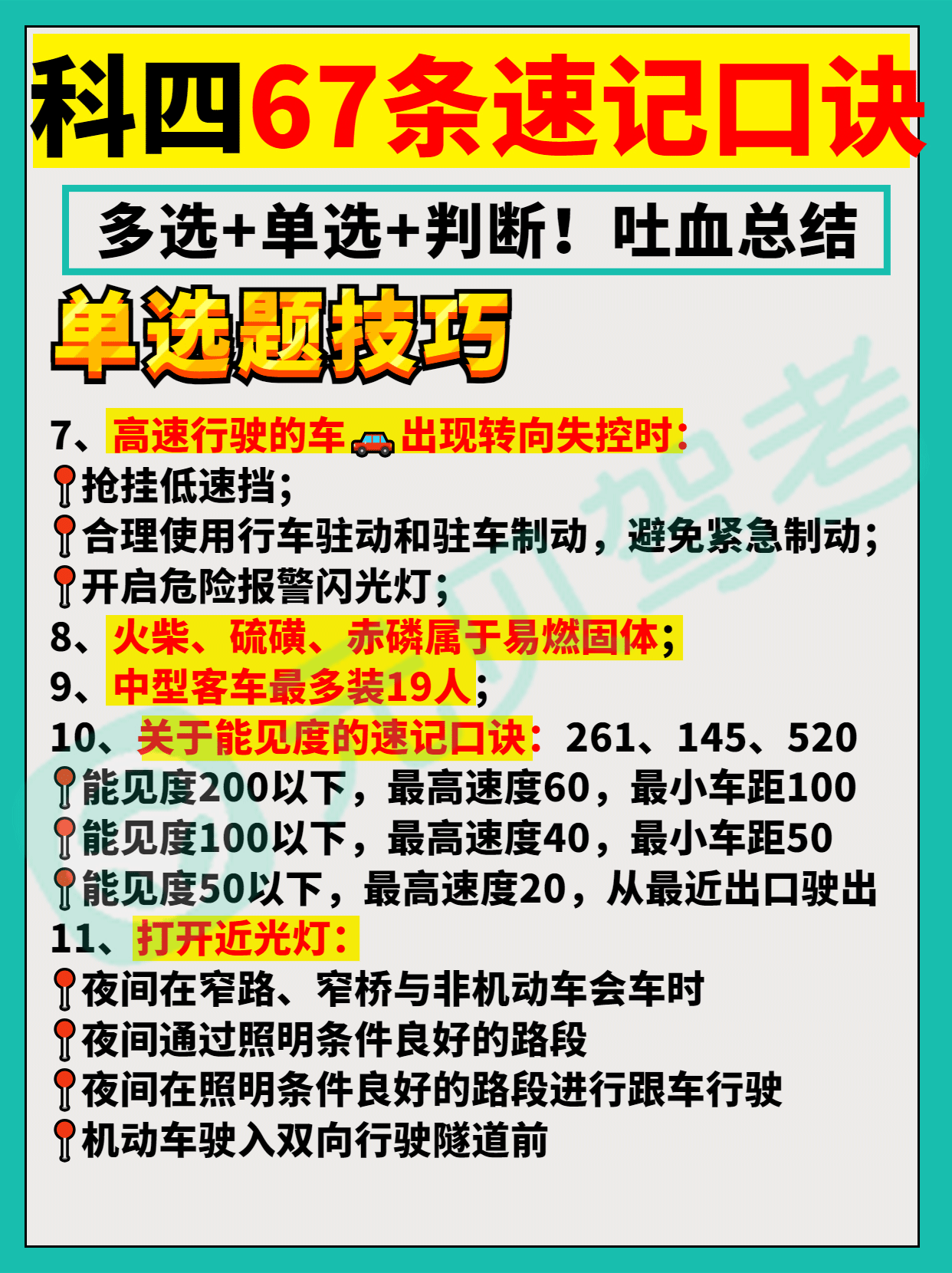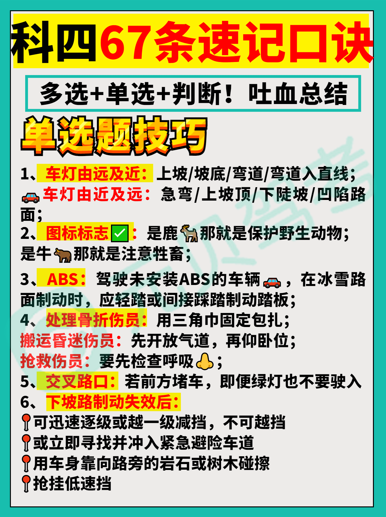 驾考科目四题库由20道单选题、10道多选题、20道判断题组成。题目以案例、动画、图片等形式出现,总分100分 ,90分及格、 今天元贝驾考整理了科目四速记口诀,希望能帮到学车考驾照的你!