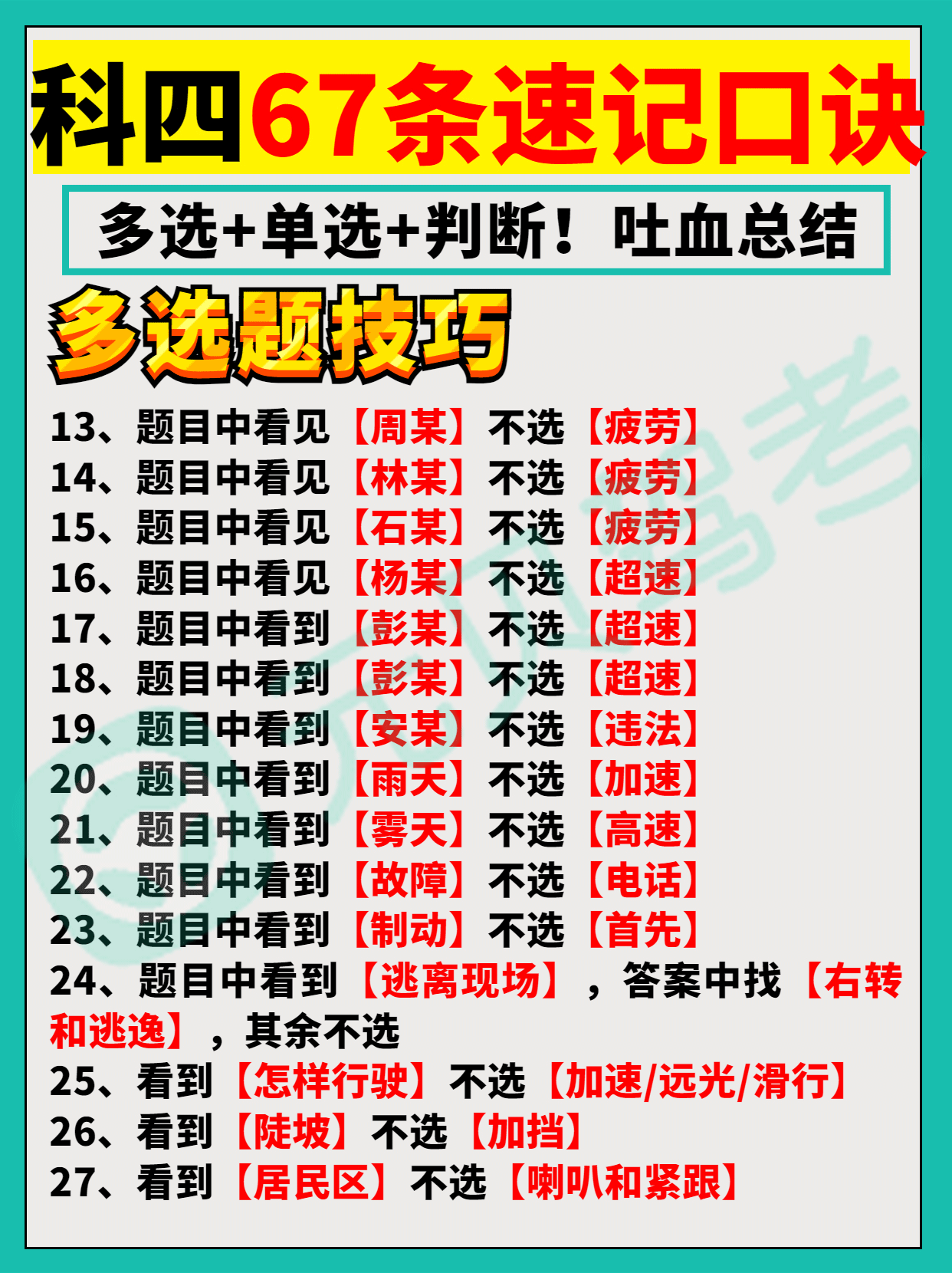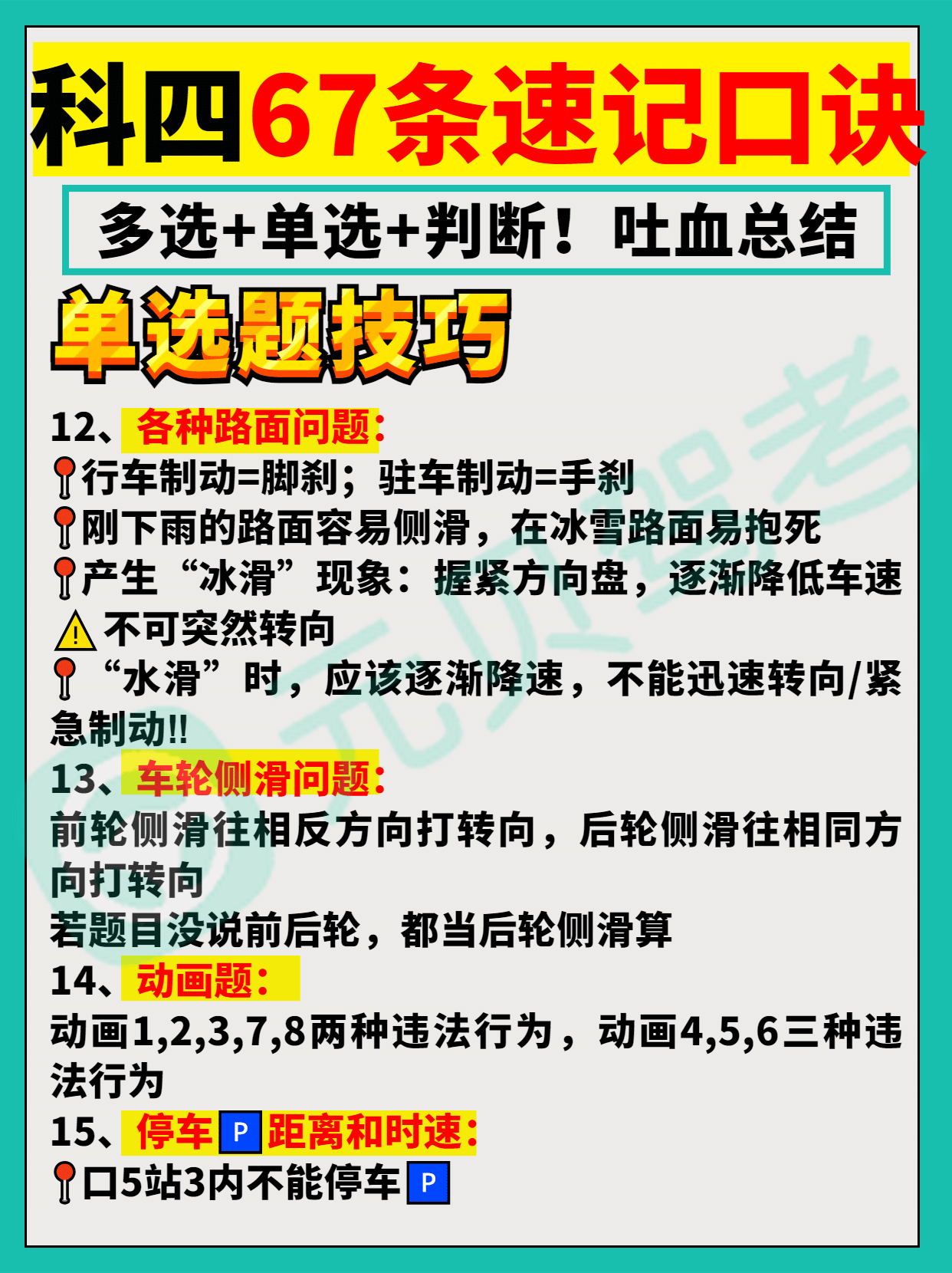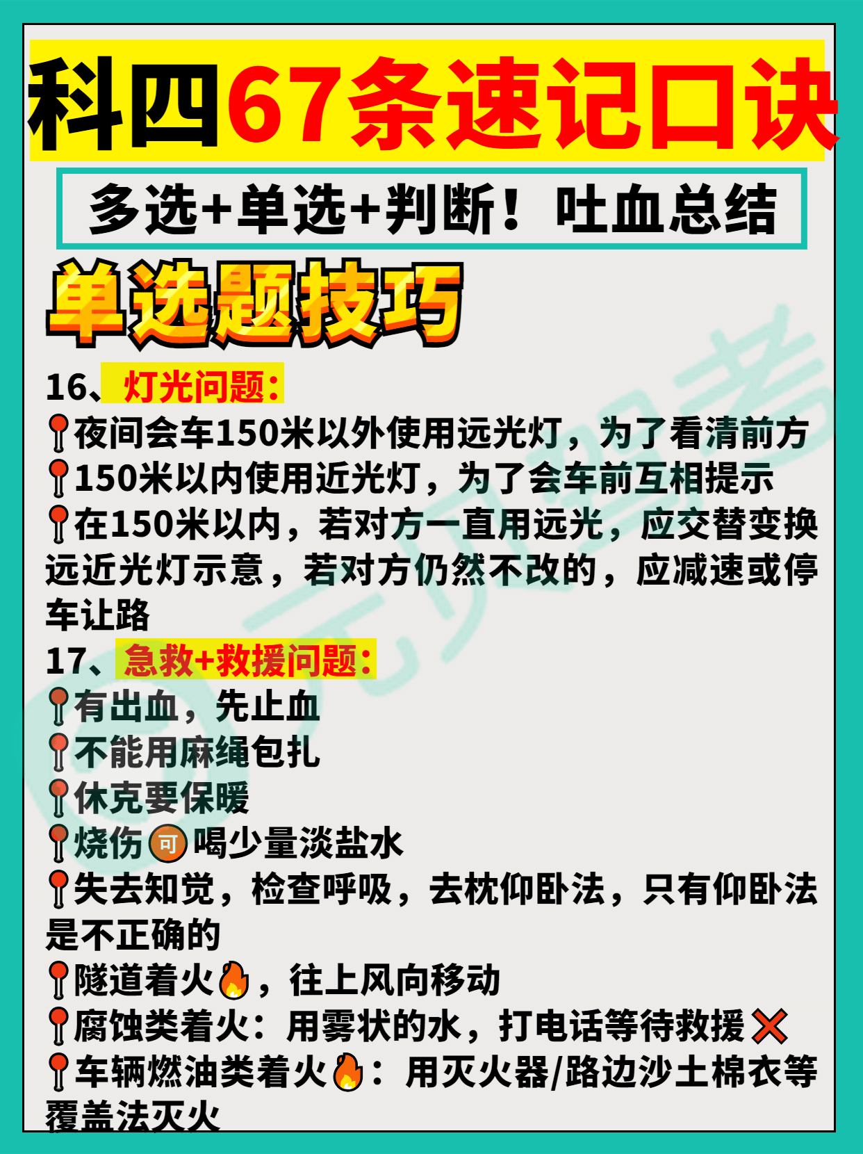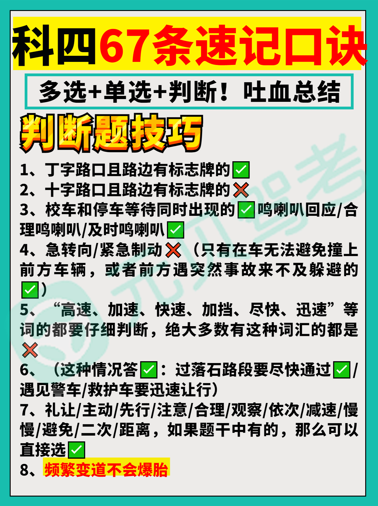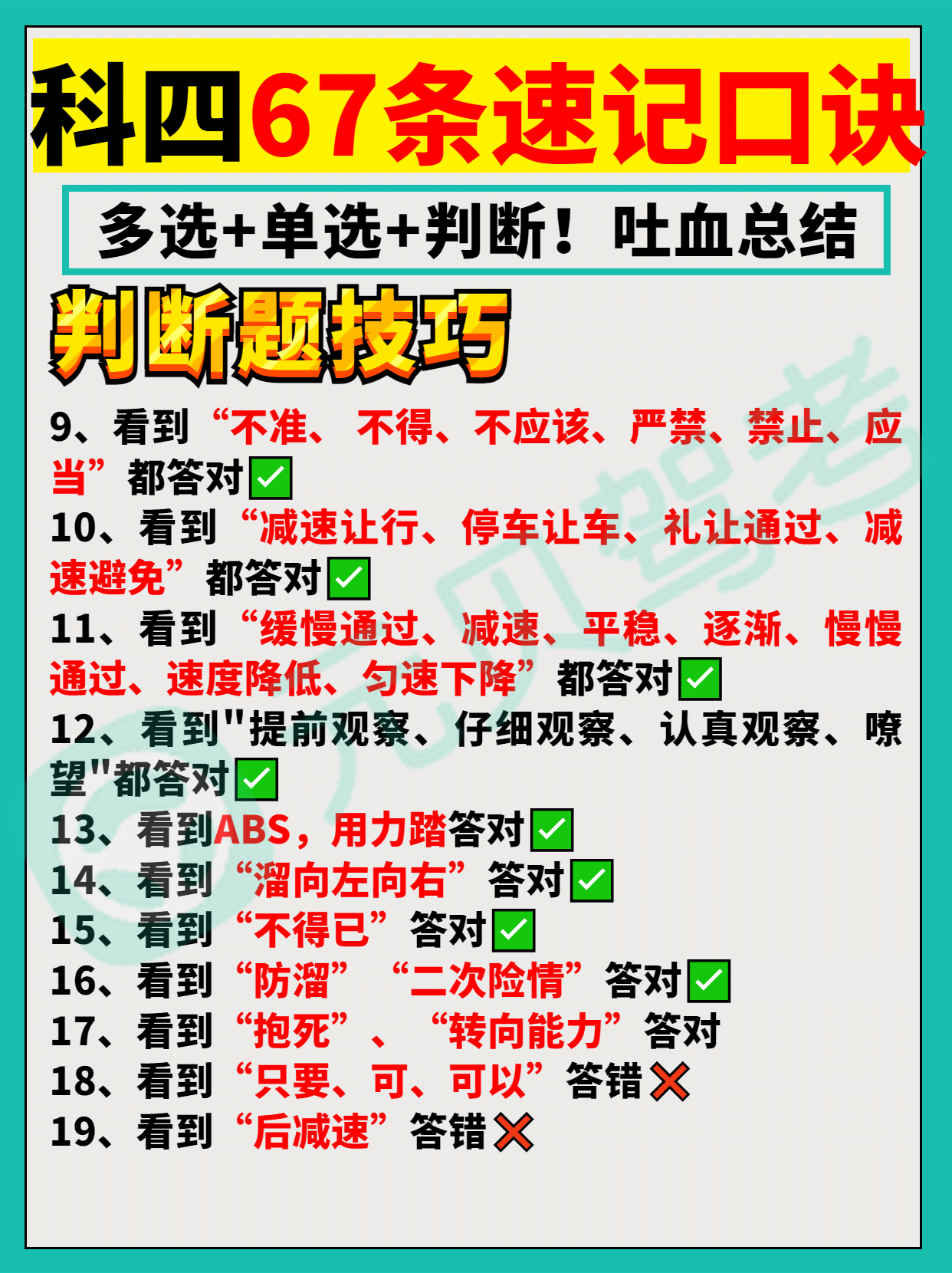 驾考科目四题库由20道单选题、10道多选题、20道判断题组成。题目以案例、动画、图片等形式出现,总分100分 ,90分及格、 今天元贝驾考整理了科目四速记口诀,希望能帮到学车考驾照的你!