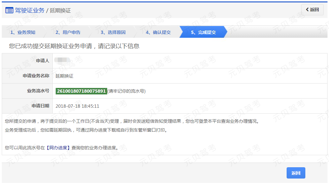 该步骤提交成功后,系统生成业务流水号。该步骤提交成功后,系统将于提交后的一个工作日(不含当天)受理,届时会发送短信告知受理结果。用户可以根据该业务流水号在网办进度中查询业务办理进度。办理成功后,用户如需延期回执,可通过网办进度下载或自行到车管所窗口打印。