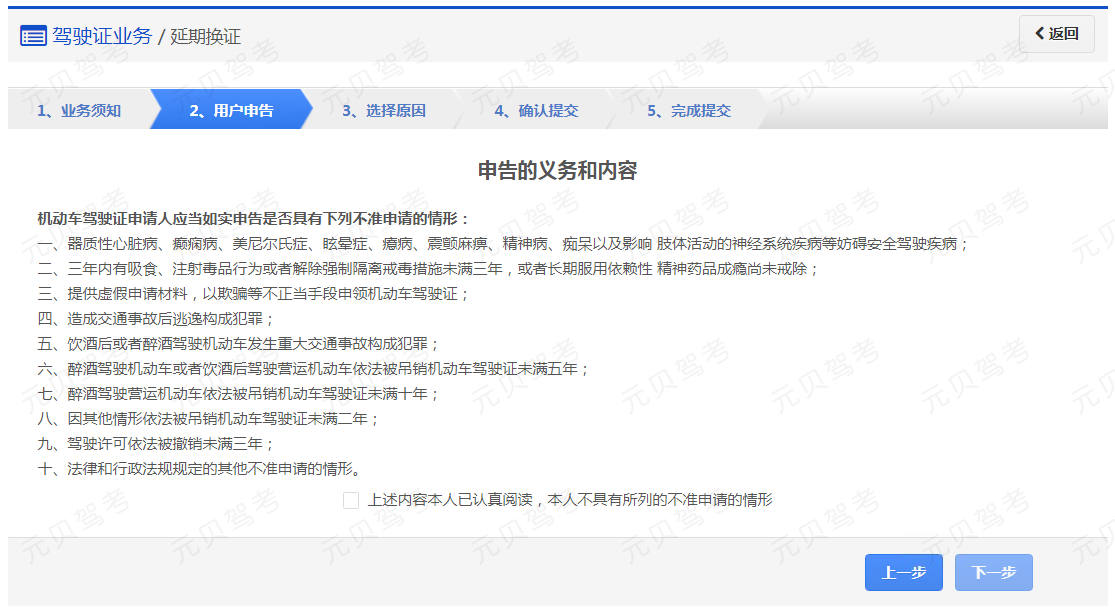 在该步骤,用户需认真阅读其内容,包括:办理延期换证需要注意的各项内容和相关责任,如下图所示。同意的,勾选“阅读并同意”,点击【下一步】进入步骤2【用户申告】。