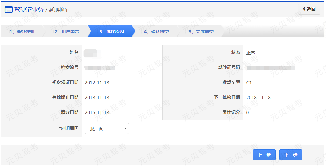 在该步骤,界面显示驾驶证的基本信息,用户认真确认各项信息无误后选择延期原因,点击【下一步】进入步骤4【确认提交】。