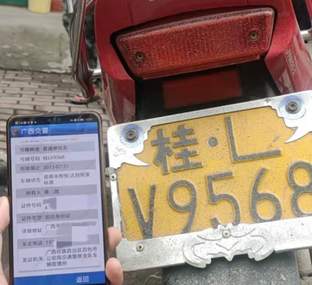 3月29日11时许,百色平果市新安街。执勤民警在对一辆悬挂“桂lv9568”号牌的二轮摩托车例行检查时,发现该车有套牌嫌疑。