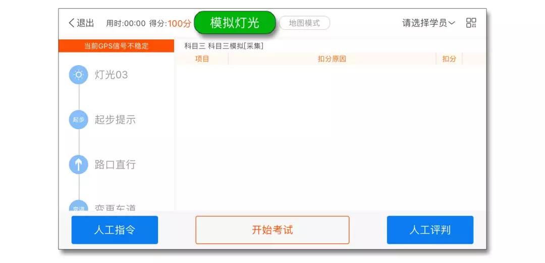 开始考试前,此按钮默认关闭,如需灯光语音播报,可以在开始考试前点亮图标,使其呈现绿色状态,考试开始后灯光语音就可以自动播报了。如果要关闭灯光,只要在考试开始前使该图标保持灰色状态,考试开始后灯光就不会自动播报了。