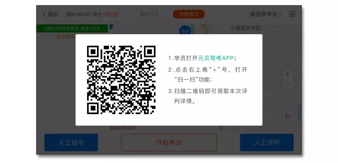 当考试结束后学员想要查看本次考试成绩,教练可在点击右上角图标后,让学员打开元贝驾考app对准出现的二维码进行扫描。