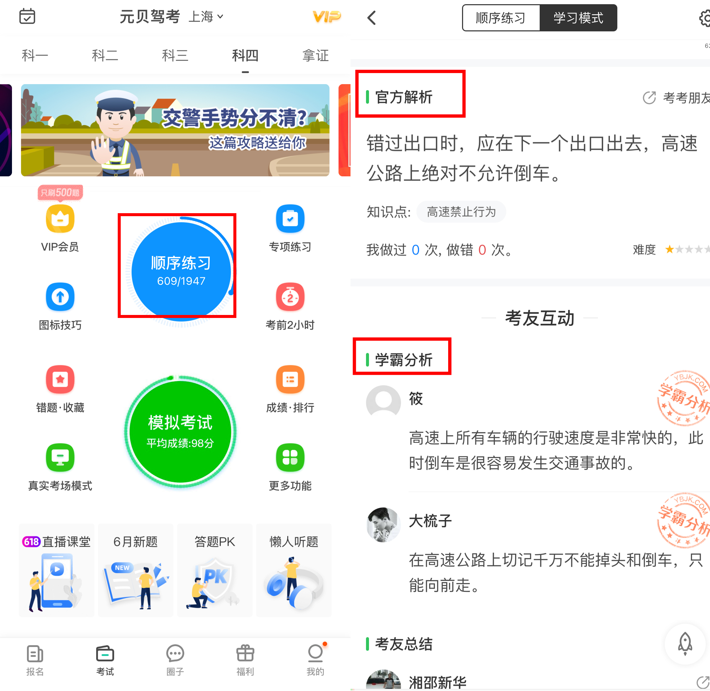 1、使用元贝驾考【顺序练习】功能:先做顺序练习,题虽多,但也很多是重复知识点的,要理解记住考点,小编在这里推荐学员多看官方解析和学霸分析。