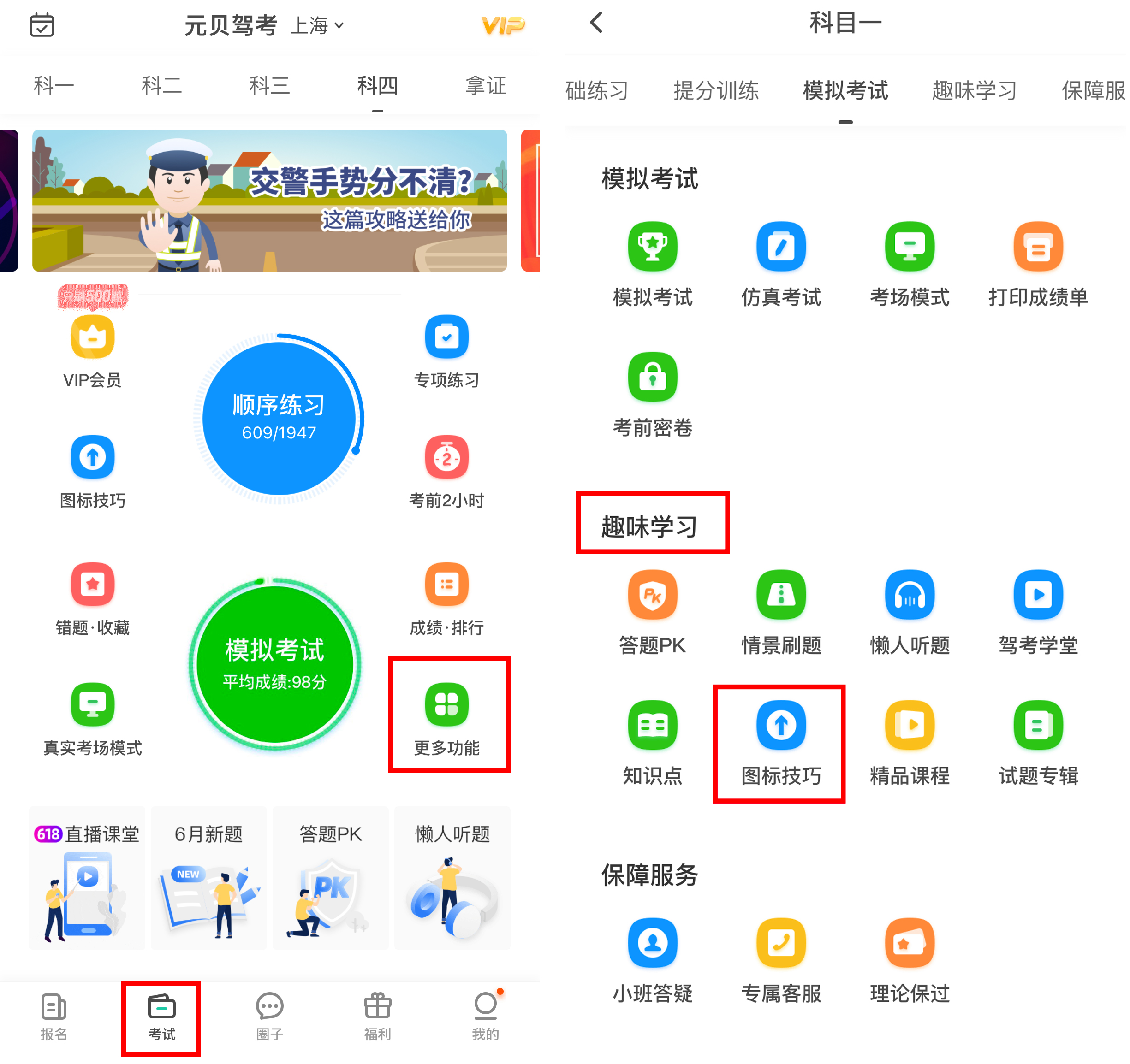 3、使用【图标技巧】功能:理论题图标很多,有的标志极其相似,傻傻分不清,这时候你就需要点击【考试】-【更多功能】-【趣味学习】-【图标技巧】