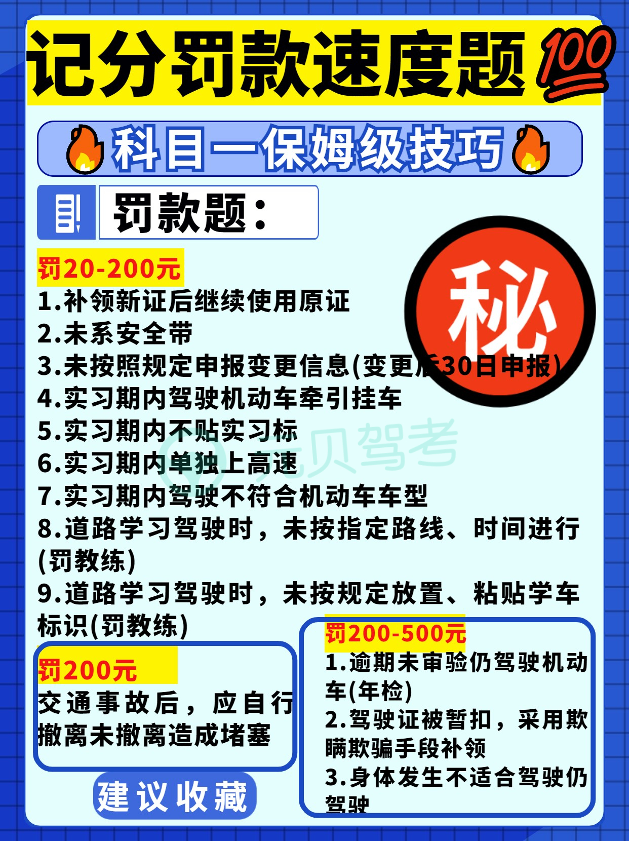 元贝驾考小编已经整理好了驾考新规科目一罚款扣分全部内容,这次扣分罚款题技巧非常全!利用好关键词,相信大家新规部分定能顺利通过!