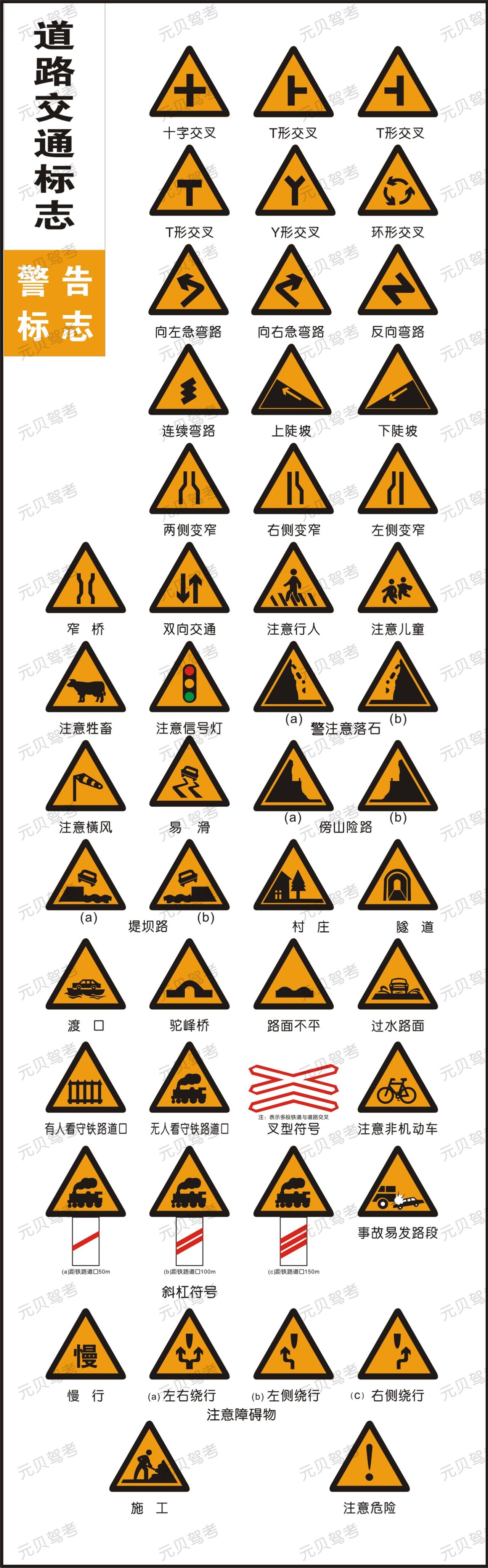 1、警告标志:警告车辆、行人注意危险地点的标志。
