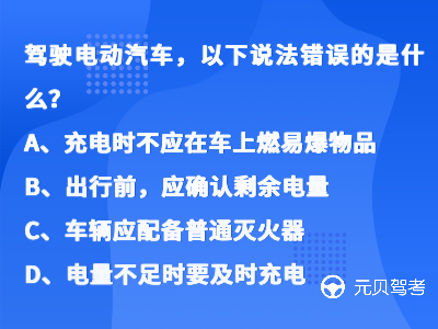 解析:请注意,题干要求选出说法错误的选项。电动汽车出行前,应提前检查好剩余电量,掌握好充电时间,尽量保证每天使用车辆后及时充电,避免因电量过低导致车辆搁浅;车充电的时候,一定要关掉用电设备,不应在车上燃易爆物品;新能源汽车没有强制规定一定要配备灭火装置,如果原车没有灭火装置的话,后期也可以进行加装灭火装置,可以考虑配备水基灭火器或者干粉灭火器。
