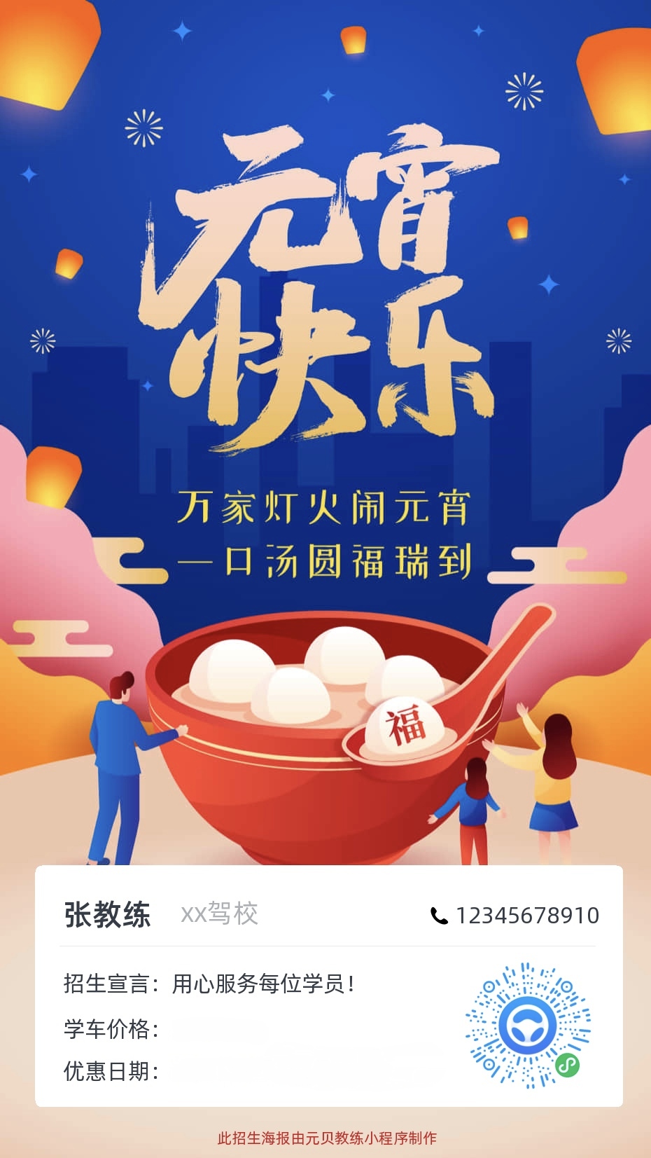 元贝教练app为广大教练定制了元宵节主题招生海报