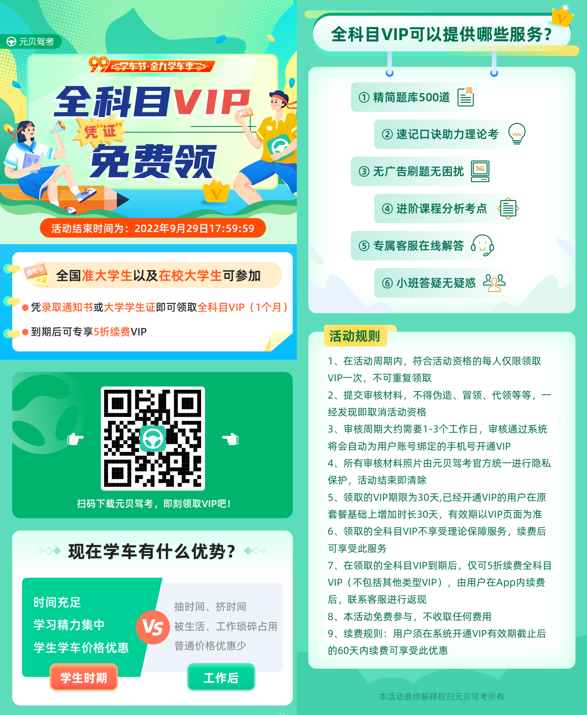 除此之外,还有一项金秋学车福利——元贝驾考全科目vip免费领!!!划重点:不止准大学生,全国在校大学生都可以参与噢!赶紧来看看吧~