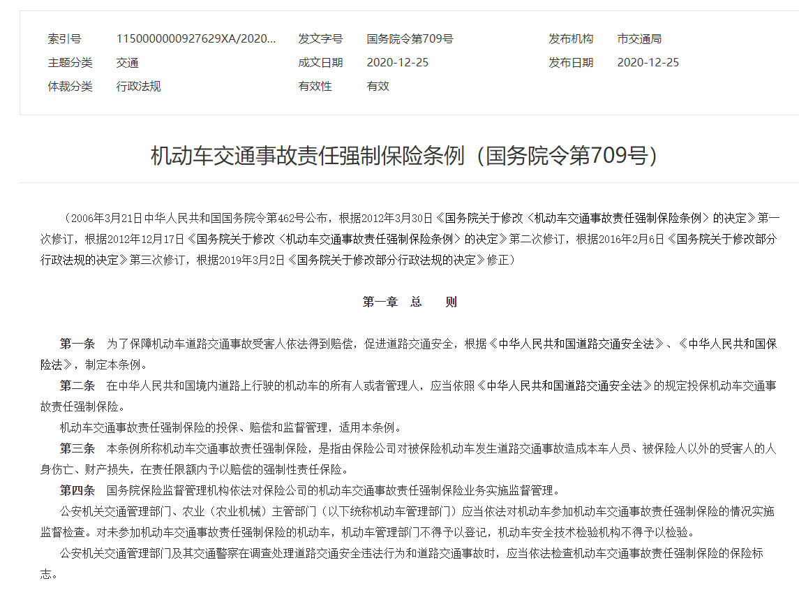 (2006年3月21日中华人民共和国国务院令第462号公布,根据2012年3月30日《国务院关于修改〈机动车交通事故责任强制保险条例〉的决定》第一次修订,根据2012年12月17日《国务院关于修改〈机动车交通事故责任强制保险条例〉的决定》第二次修订,根据2016年2月6日《国务院关于修改部分行政法规的决定》第三次修订,根据2019年3月2日《国务院关于修改部分行政法规的决定》修正)