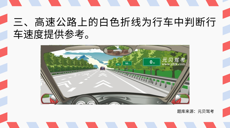 知识点补充:白色折线车距确认线总宽300厘米,线条宽40厘米或45厘米,从确认基点0米开始,每隔5米设置一道,两道为一组,间隔50米,重复设置五组,也可根据现场设置多组。