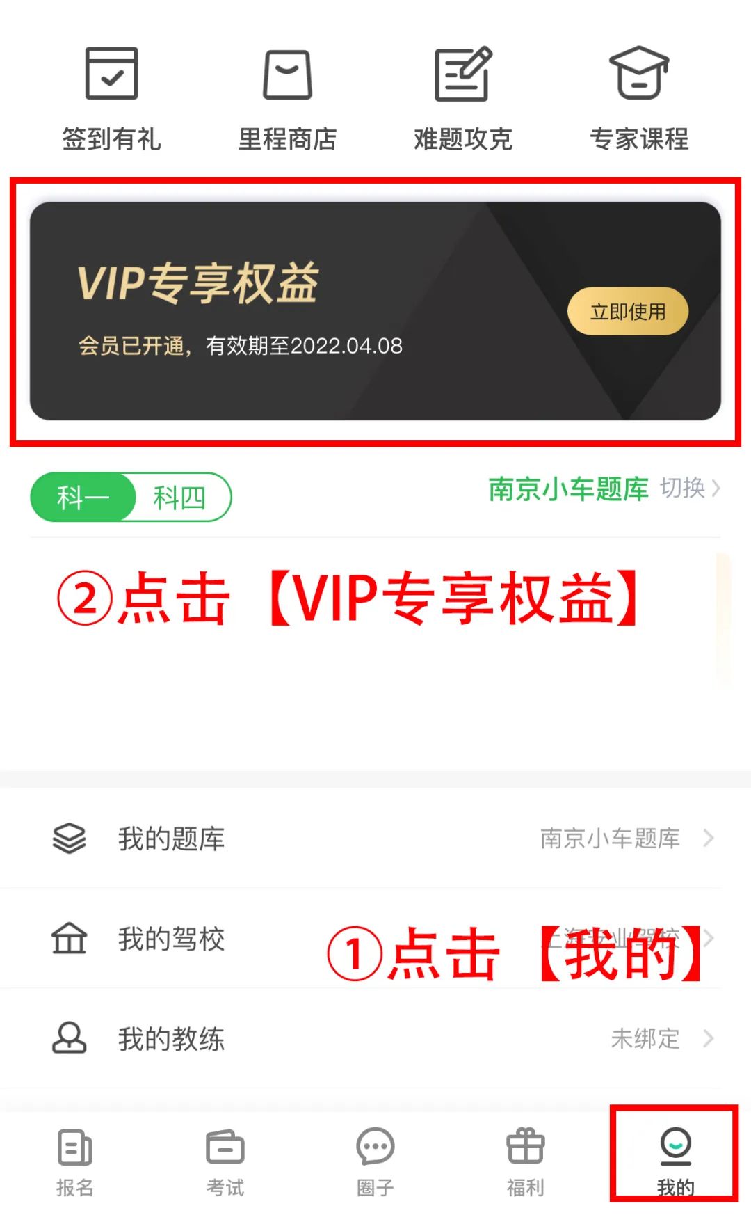 以【全科目通关vip为例】,进入会员特权的步骤在此:打开元贝驾考-【我的】-点击【vip专享权益】。