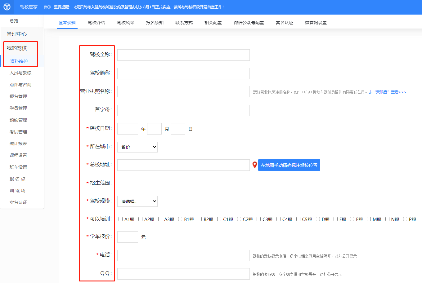 3、在【资料维护】页面按照要求填写驾校相关信息;