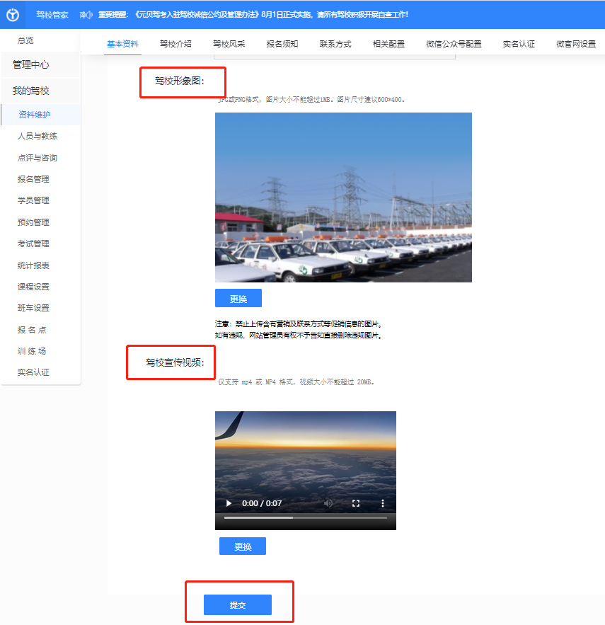 4、上传驾校形象图和驾校宣传视频,然后点击【提交】即可。