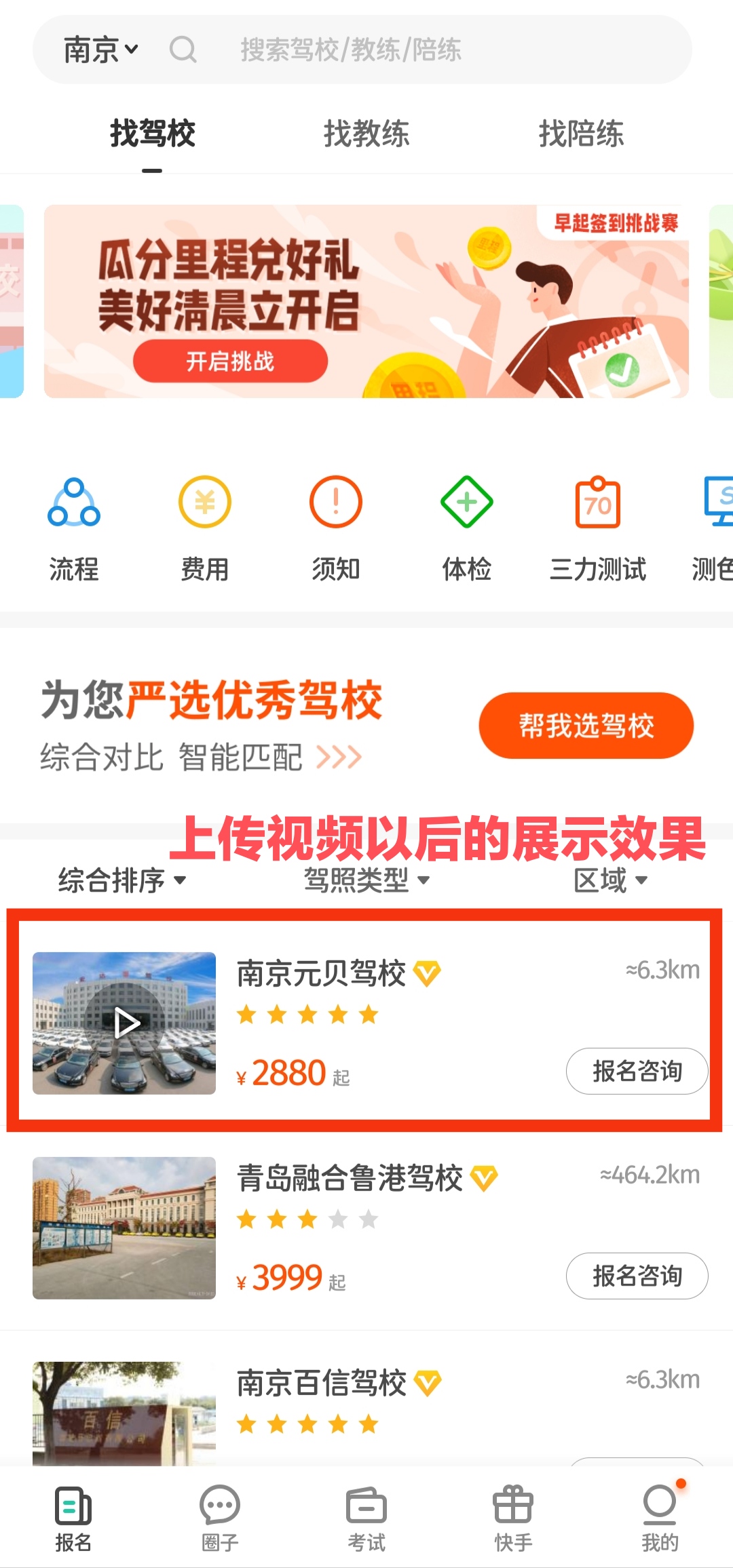 驾校上传视频以后,可以在全方位展示驾校风采的同时增驾曝光量,让更多有报名意向的学员看到,学员也可以通过点击视频看到驾校训练场地、训练条件,这样才会更放心,同时也增加了学员报名的可能性。
