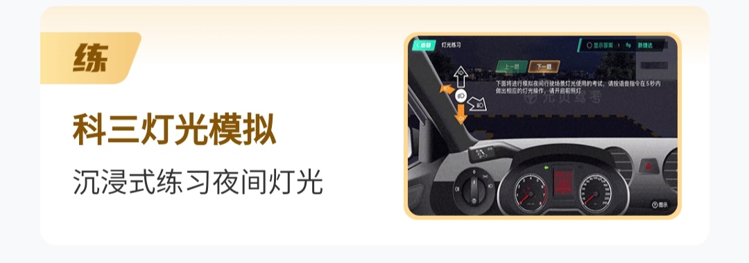 16组灯光模拟操作,全真模拟考试车系统,多种车型可供选择,学员无需上车,身临其境练一练,让考试不再慌乱!