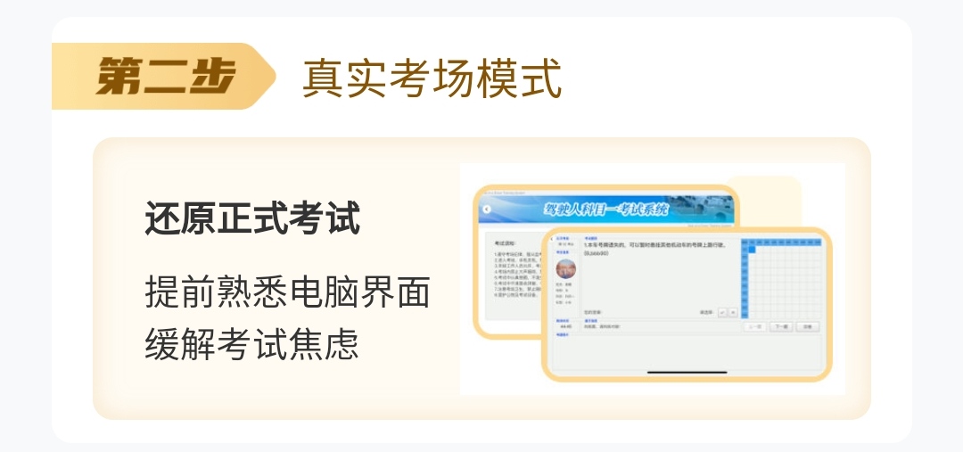 理论真实考场模拟,深度还原现场实景!打破心里防线,克服紧张焦虑,流程牢记于心,考试胸有成竹,如临考试现场,不误刷题练习。