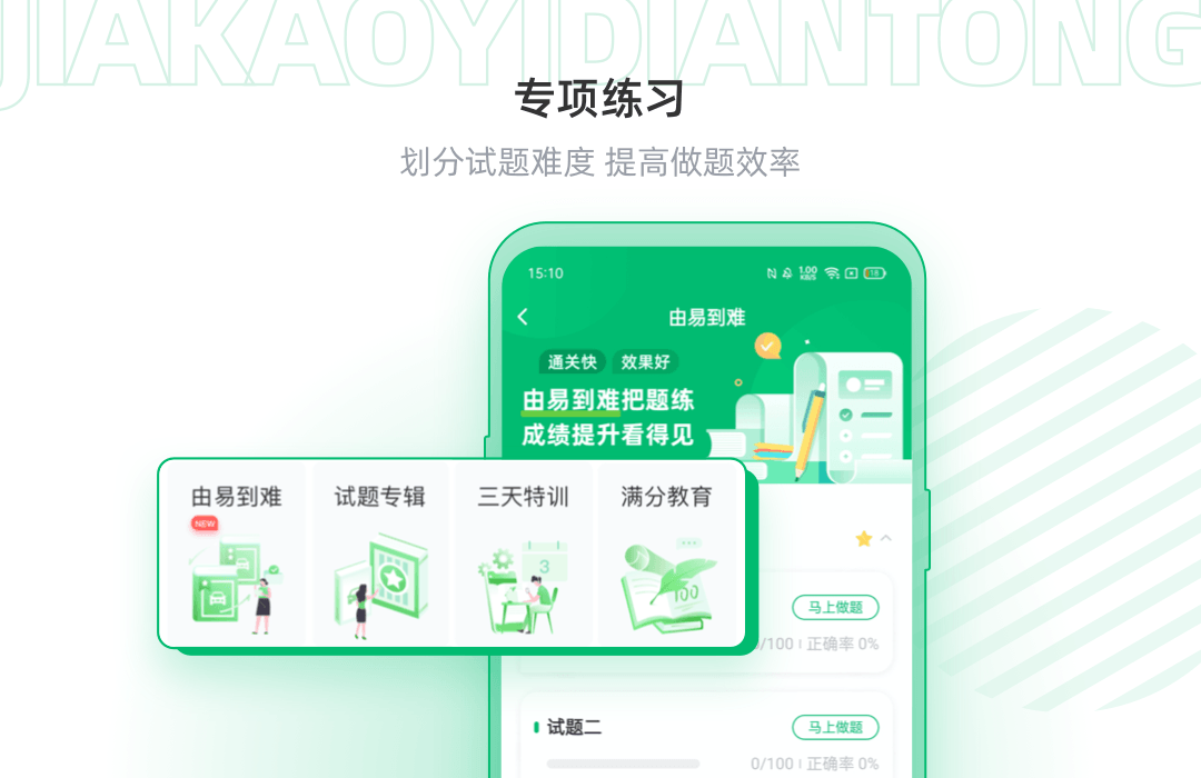 驾考一点通app推出由易到难练题功能,根据试题难易程度,将其分成5大类——容易题、简单题、一般题、易错题以及困难题。所有用户均可体验,大大减轻了练题压力,有效提高理论考试合格率。