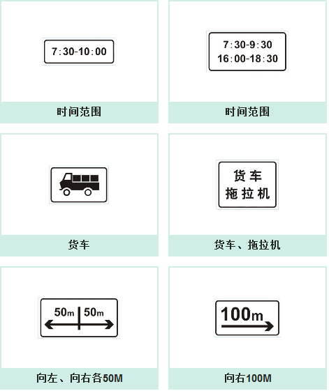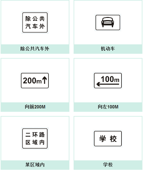 我国现代的道路交通标志分为主标志和辅助标志两大类。其中的辅助标志是附设在主标志下,起辅助说明作用标志,这种标志不能单独设立和使用。其形状为长方形,其颜色为白底、黑字、黑边框。此外,还有一种可变交通信息标志,它根据道路检测到的情况(如占道施工、阻塞、流量、流向的变化、气候状况等),把某种信息及时显示出来,传达给车辆驾驶人员和行人。