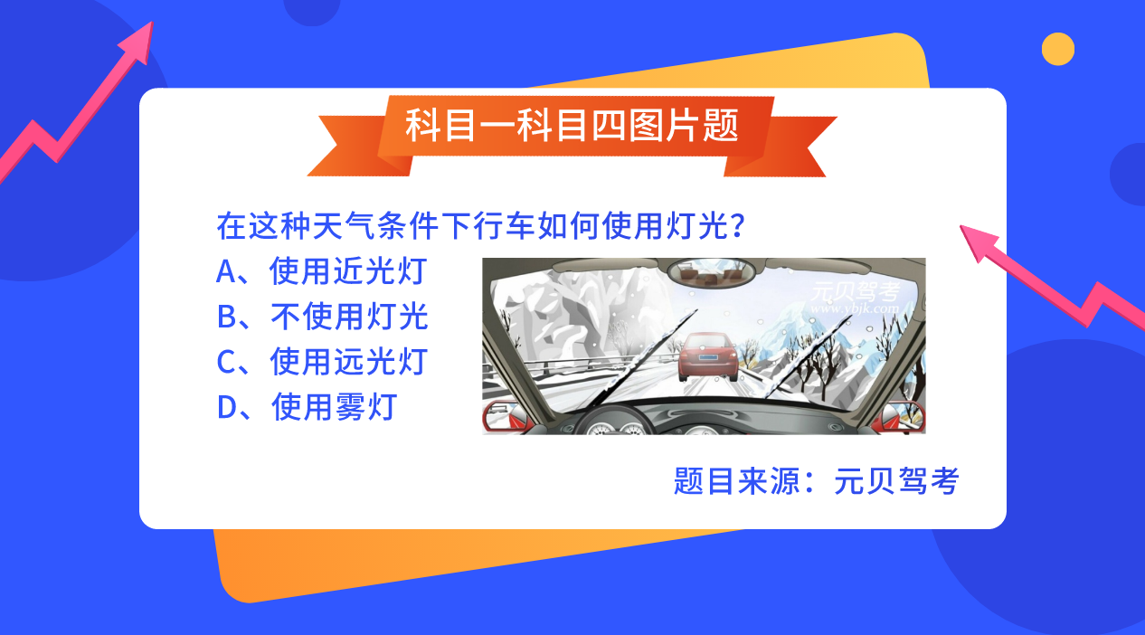 元贝分析:按照交通法规定,在雨雾雪这种低能见度天气行车,应该开启前照灯、示廓灯、后位灯。雪天影响驾驶人视线,图中这种近距离跟车的情况下,为了不影响前车司机驾驶,不能使用远光灯,应该使用近光灯。有的学员会误以为这是[雾天],应该开[雾灯]。但仔细观察,图中描绘的是[下雪],不是雾天,不用开雾灯。学员们要注意审题(包括题目图片)。