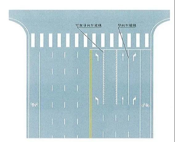 在人行横道线前的带有指向标志的道路线,单独实线带指向标是导向车道线。线条带有锯齿且没有指向标的是可变导向车道线,表示进入该车道后有不止一个车道走向,如有的路口允许右转和直行。可变导向车道有着灵活性,不同于普通的车道指示线,普通的车道只要进入车道直行就是直行,左转就是左转。一般这样的车道设在交通比较复杂的路段。