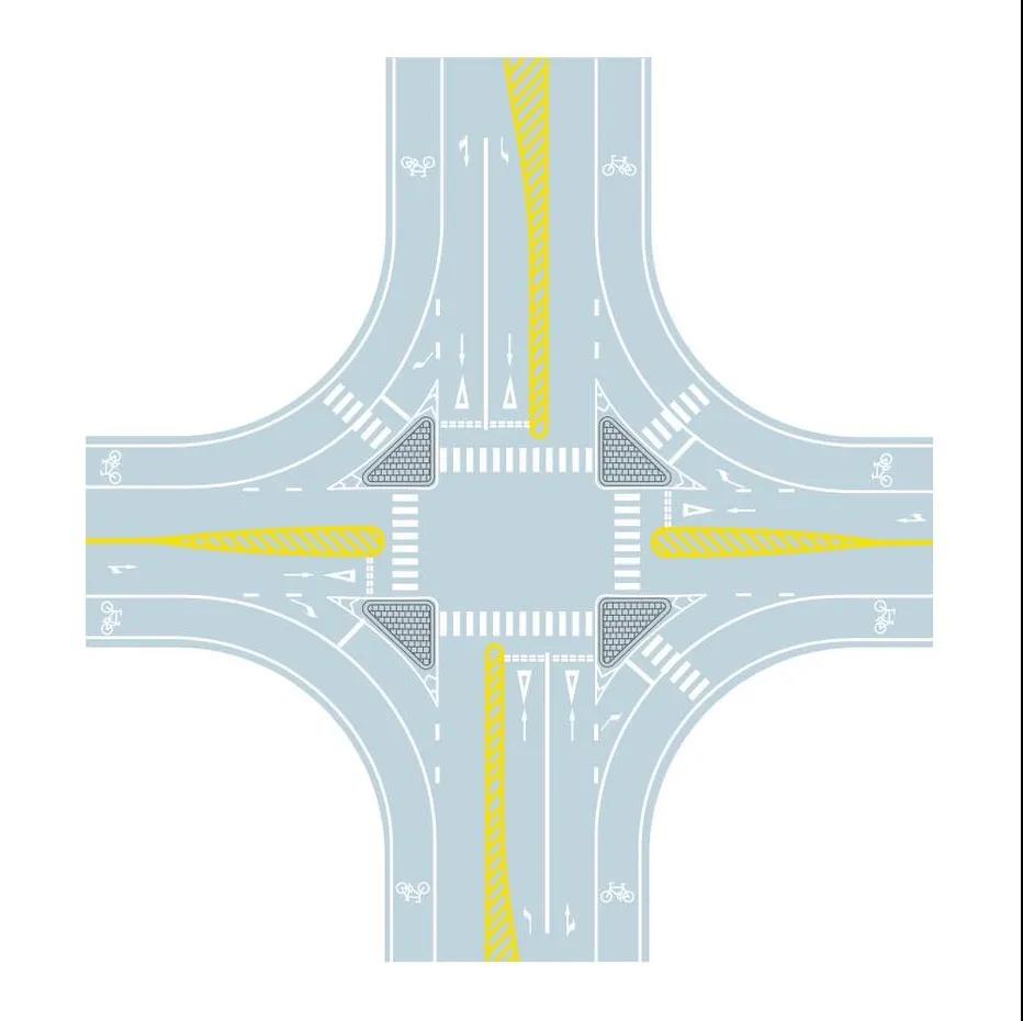 导流线的形式主要为一个或几个根据路口地形设置的白色v形线或斜纹线区域,表示车辆必须按规定的路线行驶,不得压线或越线行驶。主要用于过宽、不规则或行驶条件比较复杂的交叉路口,立体交叉的匝道口或其他特殊地点。