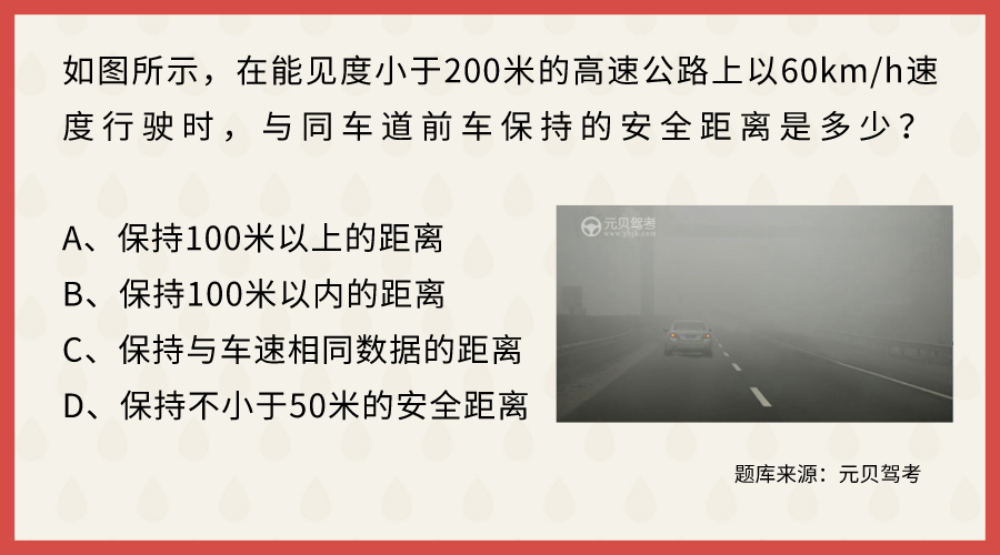 官方解析:驾驶机动车在高速公路上行驶,遇到能见度小于200米时,需要与前车保持最少100米以上距离,并且控制车速在60km/h。