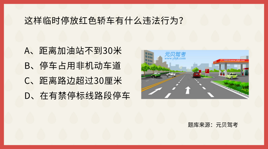 官方解析:图中为加油站,按照道路法规规定在此设施30米以内,不能停车,需要使用加油站车辆应该按照规定停车使用。