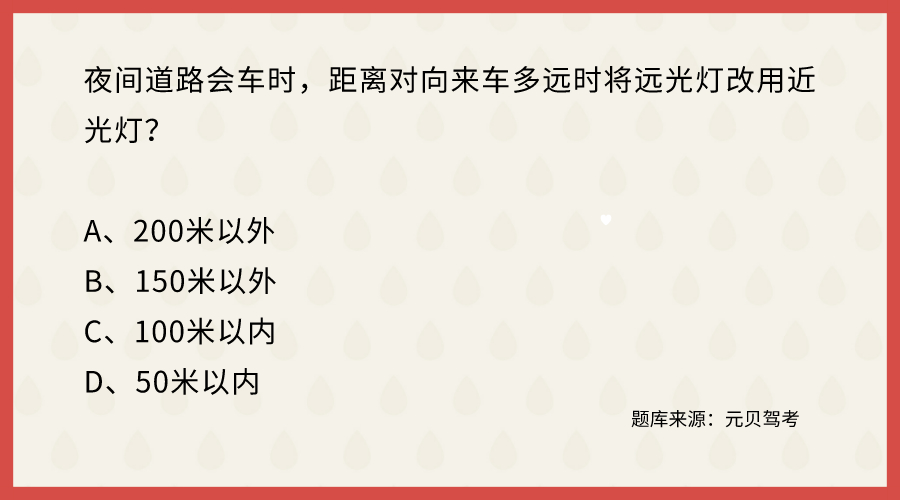 官方解析:夜间在没有中心隔离带或中心线的道路上会车时,应该在距离对向来车150米以外就将远光灯切换至近灯光。