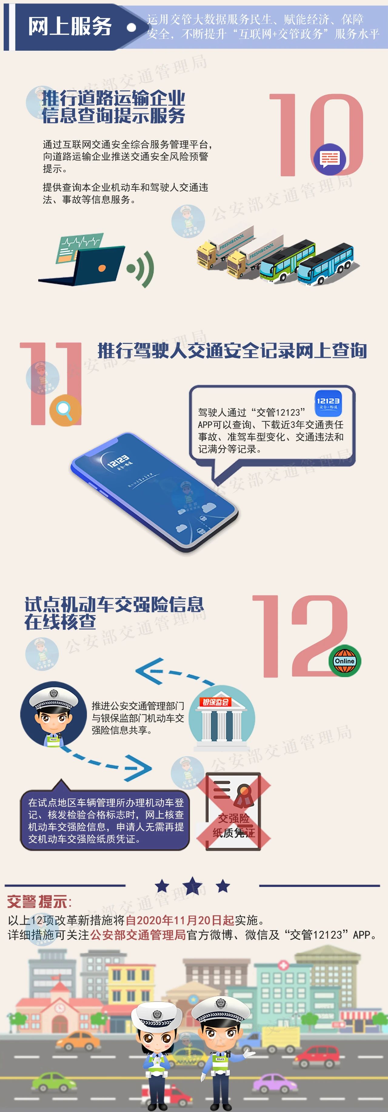 总有车主、驾驶人表示一不小心就忘记处理违法、参加“两个教育”学习...这不,10月22日,公安部通报推出优化营商环境12项措施。其中,为了进一步深化“网上服务”优化了群众办事体验,不断提升“互联网 交管政务”服务水平。便利群众办理交管业务,提升服务水平,11月20日新措实施后,车主、驾驶人可享受在线查询、提示等服务。驾驶人可以通过“交管12123”app可以查询、下载交通责任事故、准驾车型变化、交通违法和记等记录,方便其从业、应聘等。