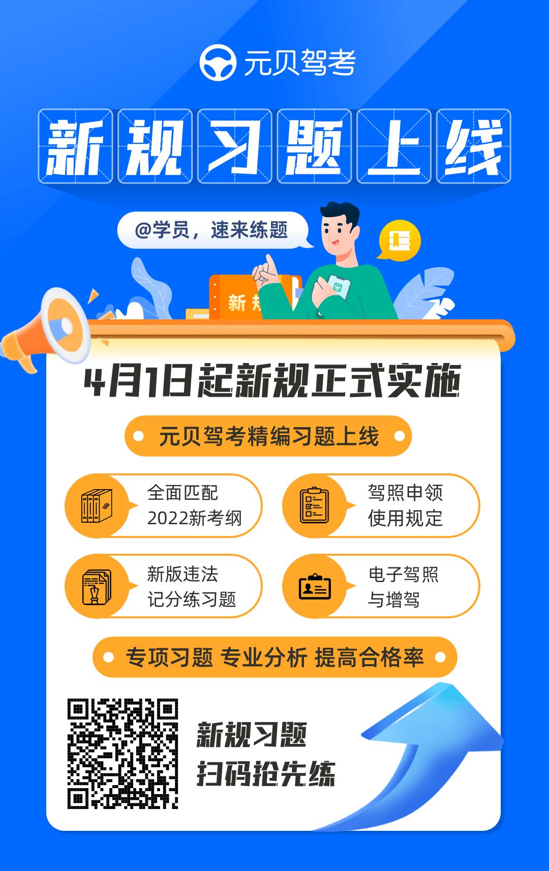 不少学员担心新政全面实施了,驾考试题和答案会不会变化?大家请放心,元贝驾考紧跟新规趋势,已经在第一时间更新科目一、科目四题库,学员们可以先人一步进行练题啦!(老版本用户请更新到元贝驾考版app,体验新规题库。)