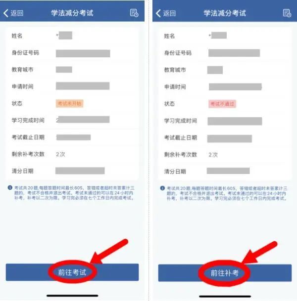 在已经完成学习的情况下,点击“前往考试”进入考试,如之前考试没通过且剩余考试次数还有的情况下,点击“前往补考”进入补考。