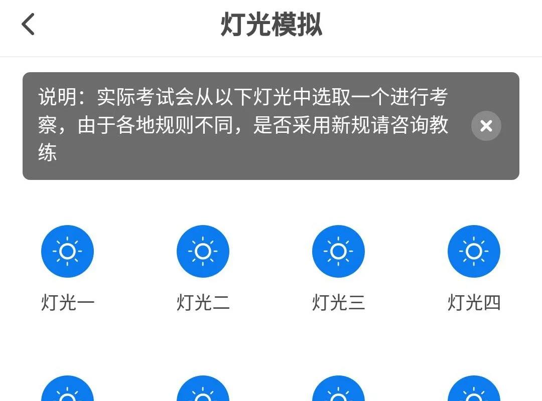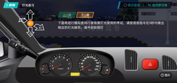 根据语音指令,在规定的时间内点击屏幕进行灯光操作。注意:在灯光练习模式下手动切题,操作正确就点击下一题,操作错误可查看视频讲解或引导教程进行纠错,也可再练~但是在模拟考试中,一旦答错,从头再来噢!