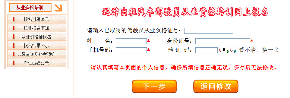 5、根据个人实际情况选择后,然后输入姓名、身份证号、手机号码这三项基本信息,填写完整后请仔细核对确认无误后再点“下一步”,这三项信息保存后不能修改。 如果想修改其它信息,也需要在本页面中输入姓名、身份证号、手机号码,然后点击“下一步”,系统会自动调出以前的信息。 其中本界面中的已取得的驾驶员从业资格证号是在本次培训报名之前已经取得的出租驾驶员从业资格证的号码。 |