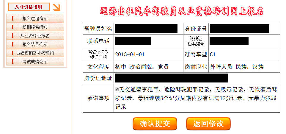 7、在上面的页面点击“提交预览”后,就会进入到详细信息的预览页面,请仔细核对个人信息是否正确,确认无误后,点击“确认提交”。 如果发现信息有错误,请点击“返回修改”,返回到上一页面进行修改,修改后再提交。 |