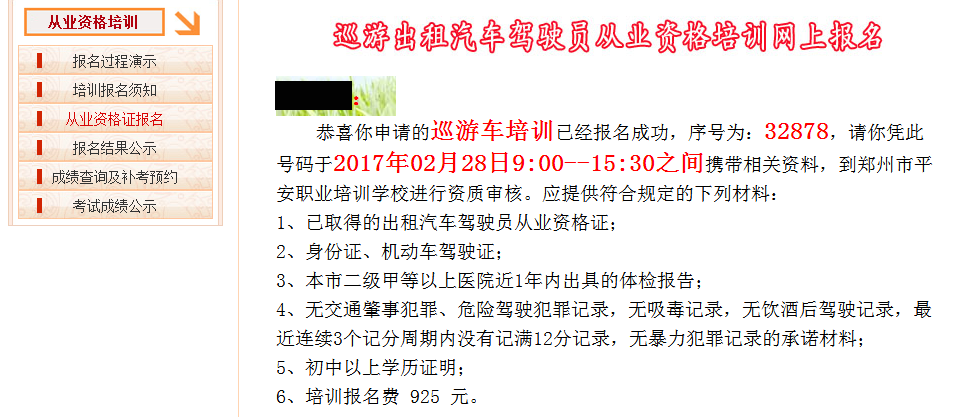8、报名成功后,系统会给出一个提示,请记下你的序号,带齐相关证件,按照规定时间到选择的培训学校进行资质审核。 |