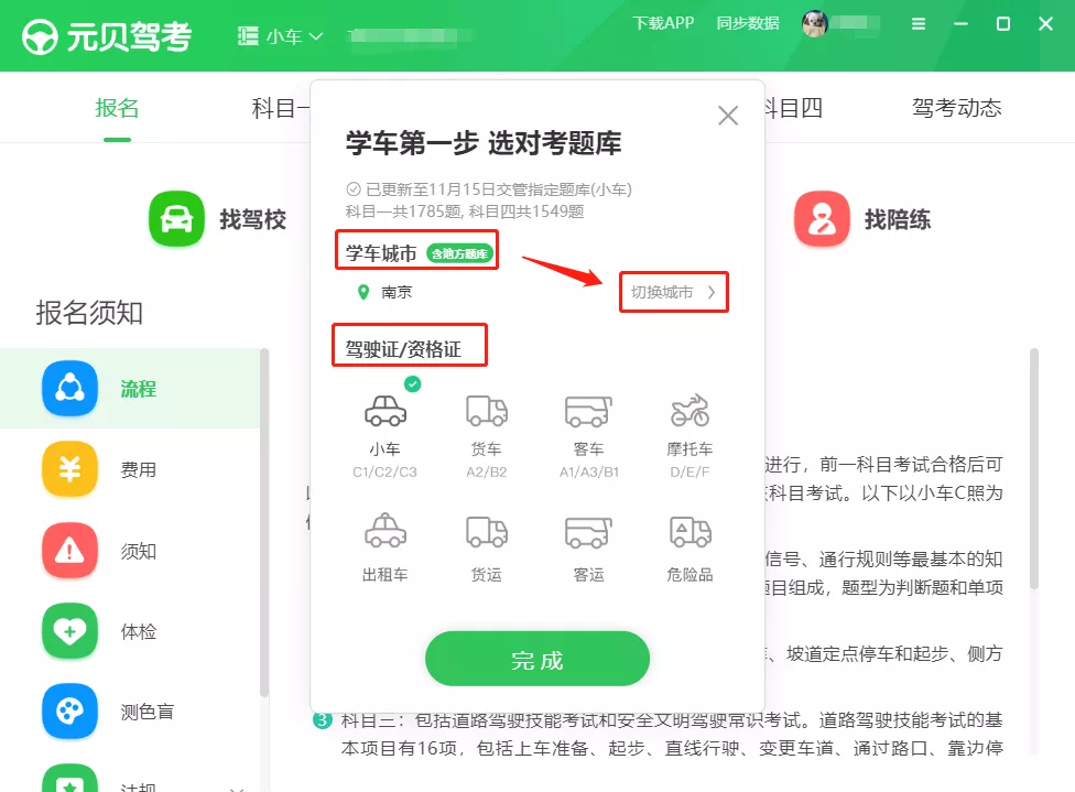 选择学车所在城市、报考的驾驶证类型,就能自动完成题库更新。